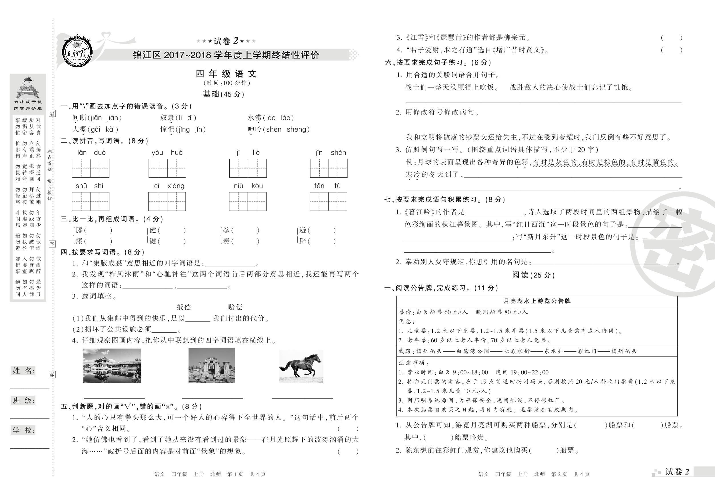 2017-2018学年第一学期成都市锦江区四年级语文试卷(北师版)【2】