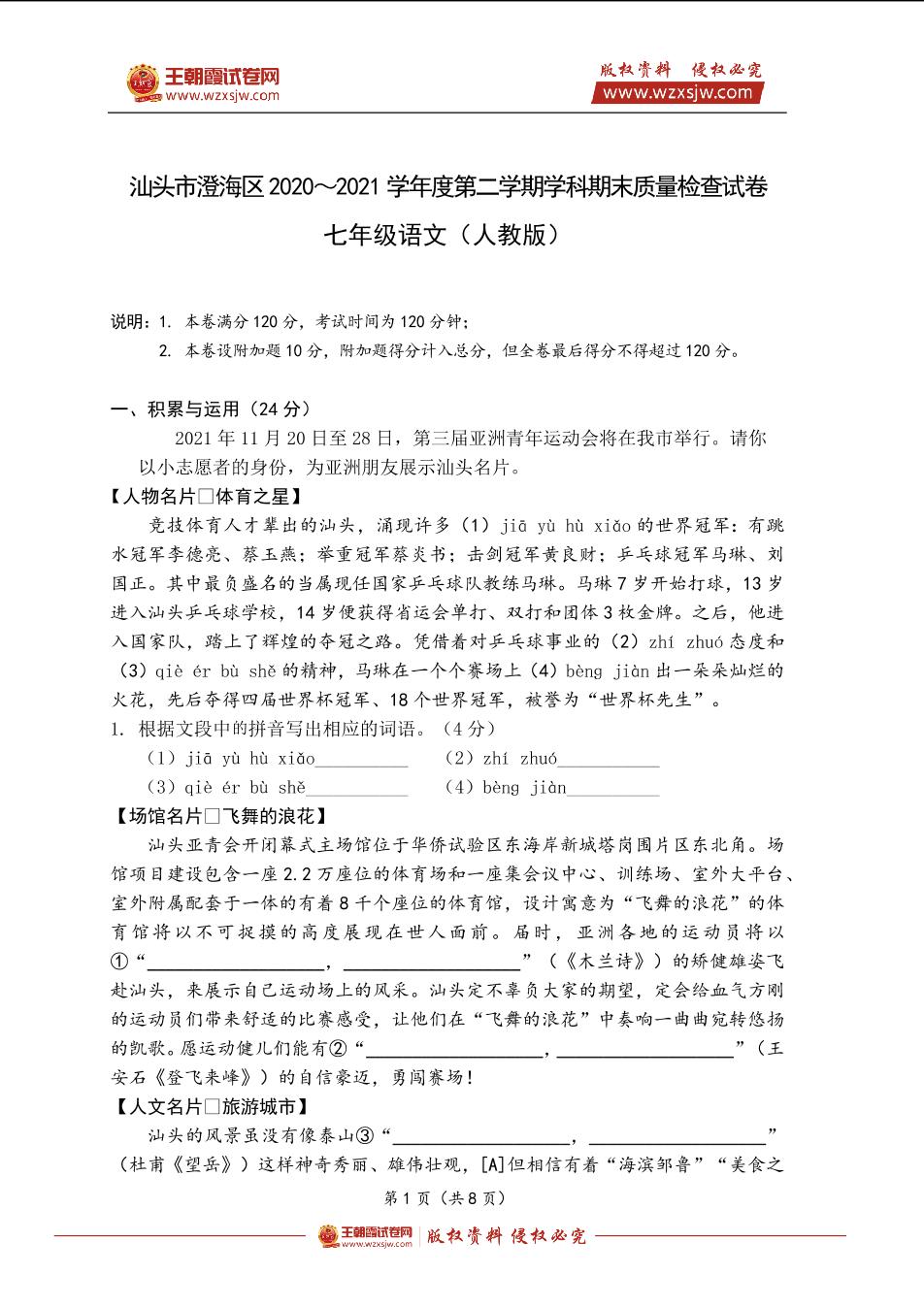 汕头市澄海区2020~2021学年度第二学期七年级语文学科期末质量检查试卷(人教版)