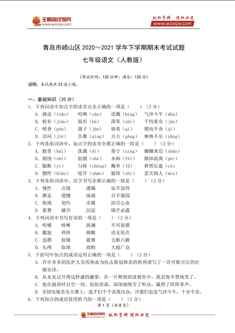 青岛市崂山区2020~2021学年下学期七年级语文期末考试试题(人教版)
