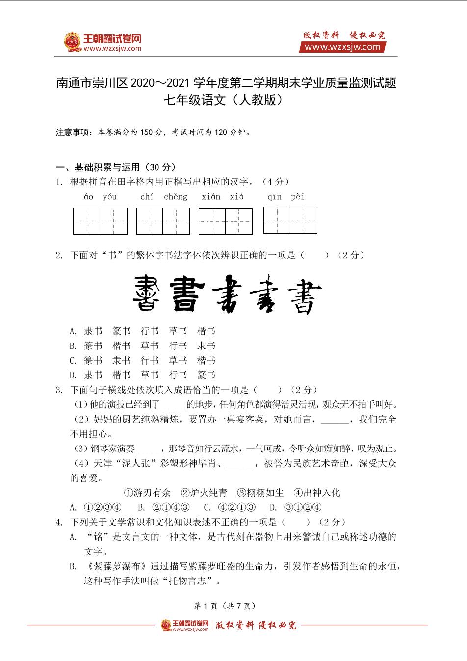 南通市崇川区2020~2021学年度第二学期七年级期末学业质量监测语文试题(人教版)