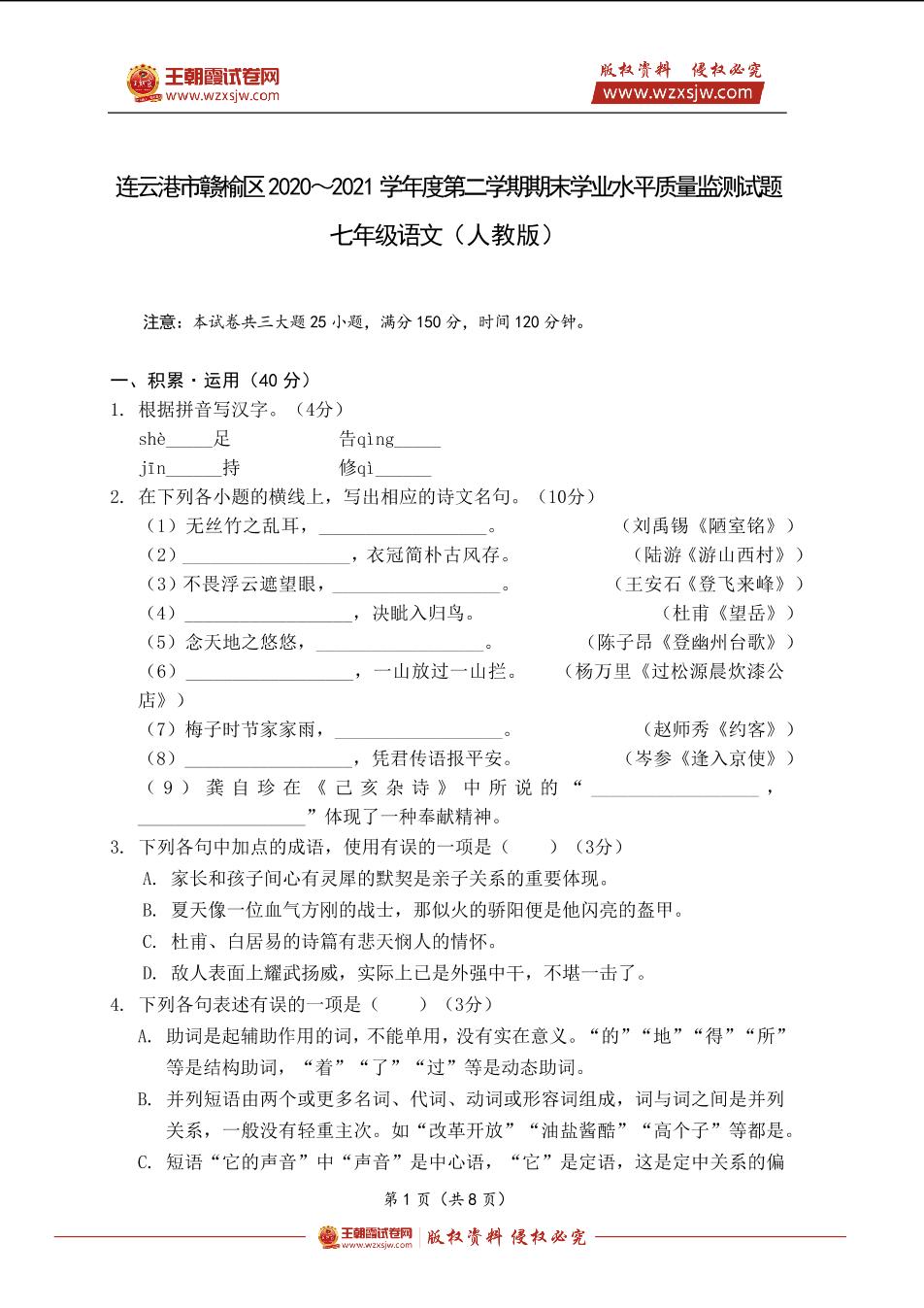 连云港市赣榆区2020~2021学年度第二学期期末学业水平质量监测七年级语文试题(人教版)