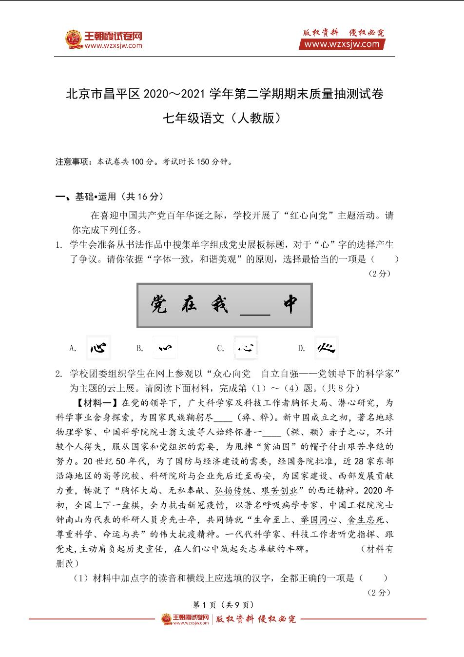 北京市昌平区2020~2021学年第二学期七年级语文期末质量抽测试卷(人教版)