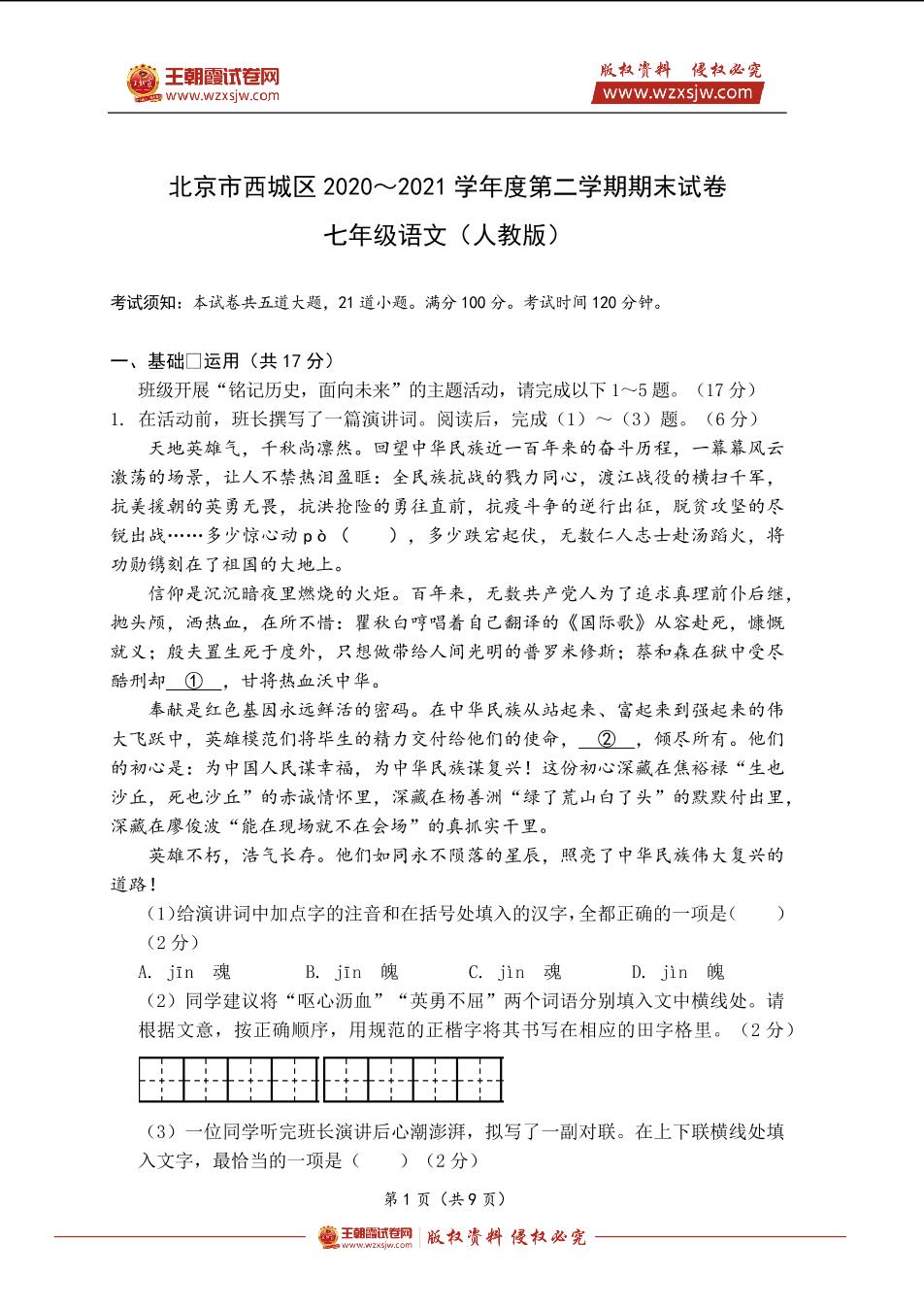 北京市西城区2020~2021学年度第二学期七年级语文期末试卷(人教版)