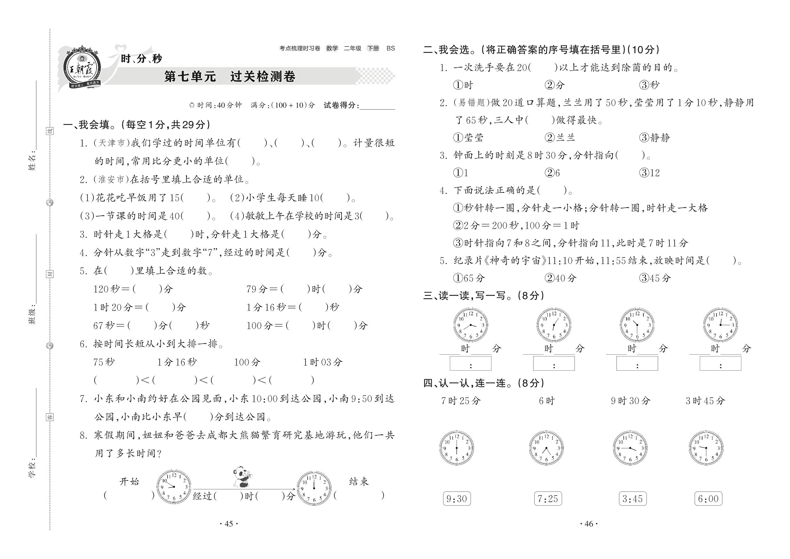 2022下册二年级数学北师版 第七单元 过关检测卷