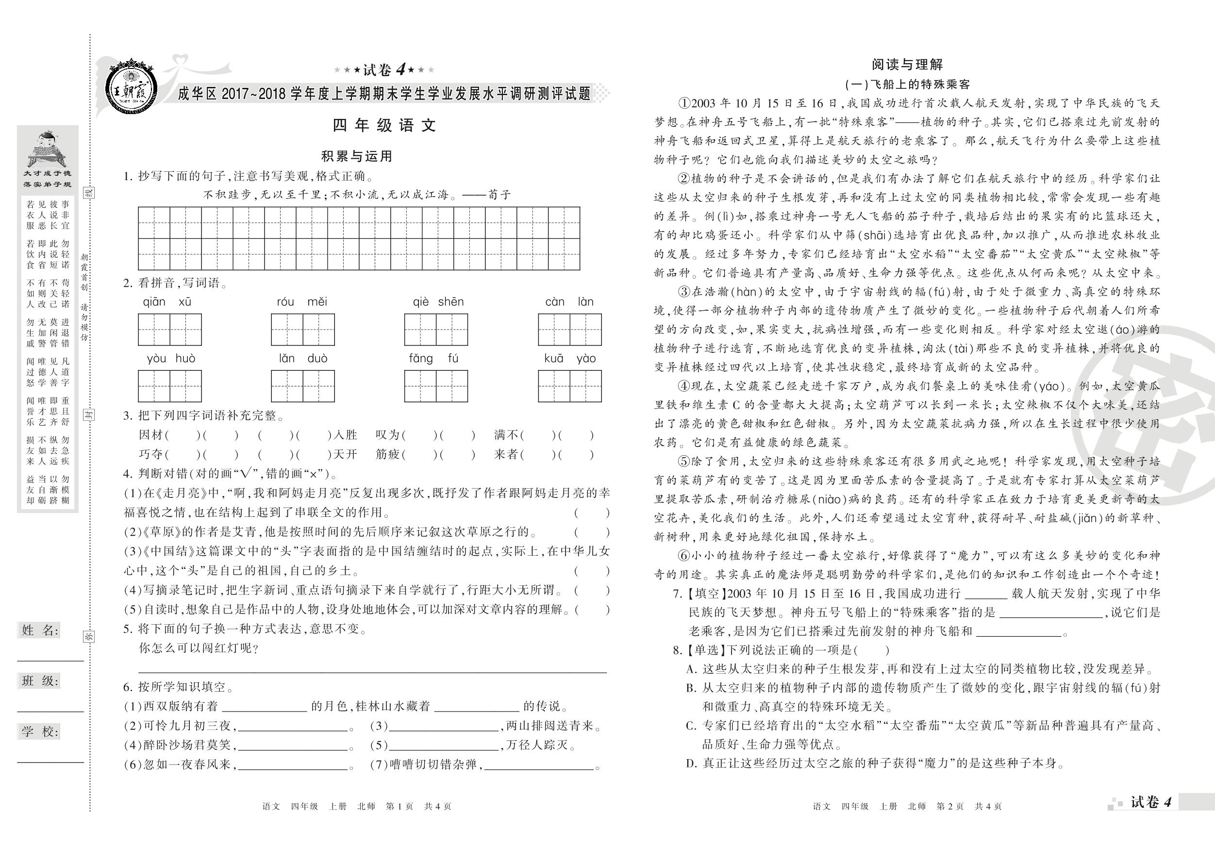 2017-2018学年第一学期成都市成华区四年级语文试卷(北师版)【4】