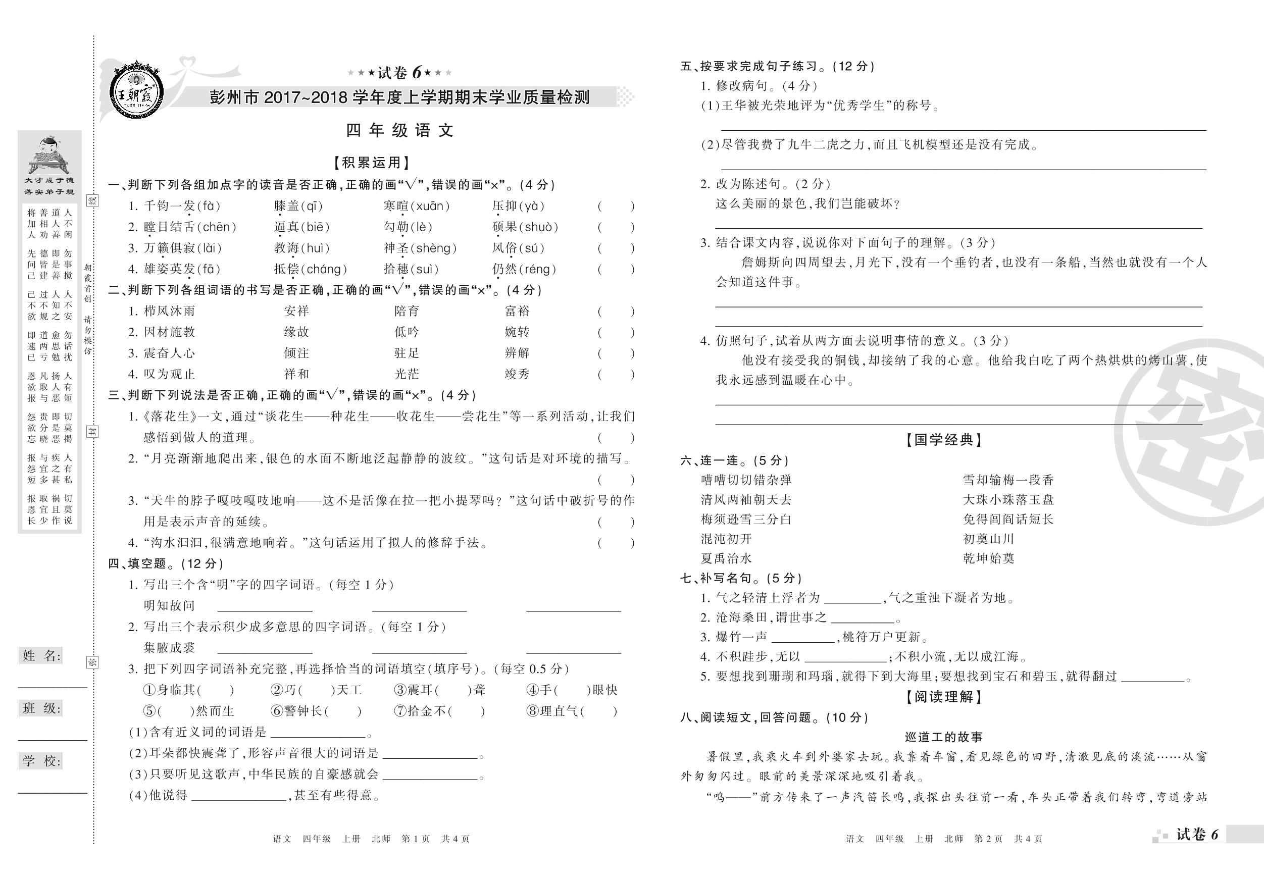 2017-2018学年第一学期彭州市四年级语文试卷(北师版)【6】
