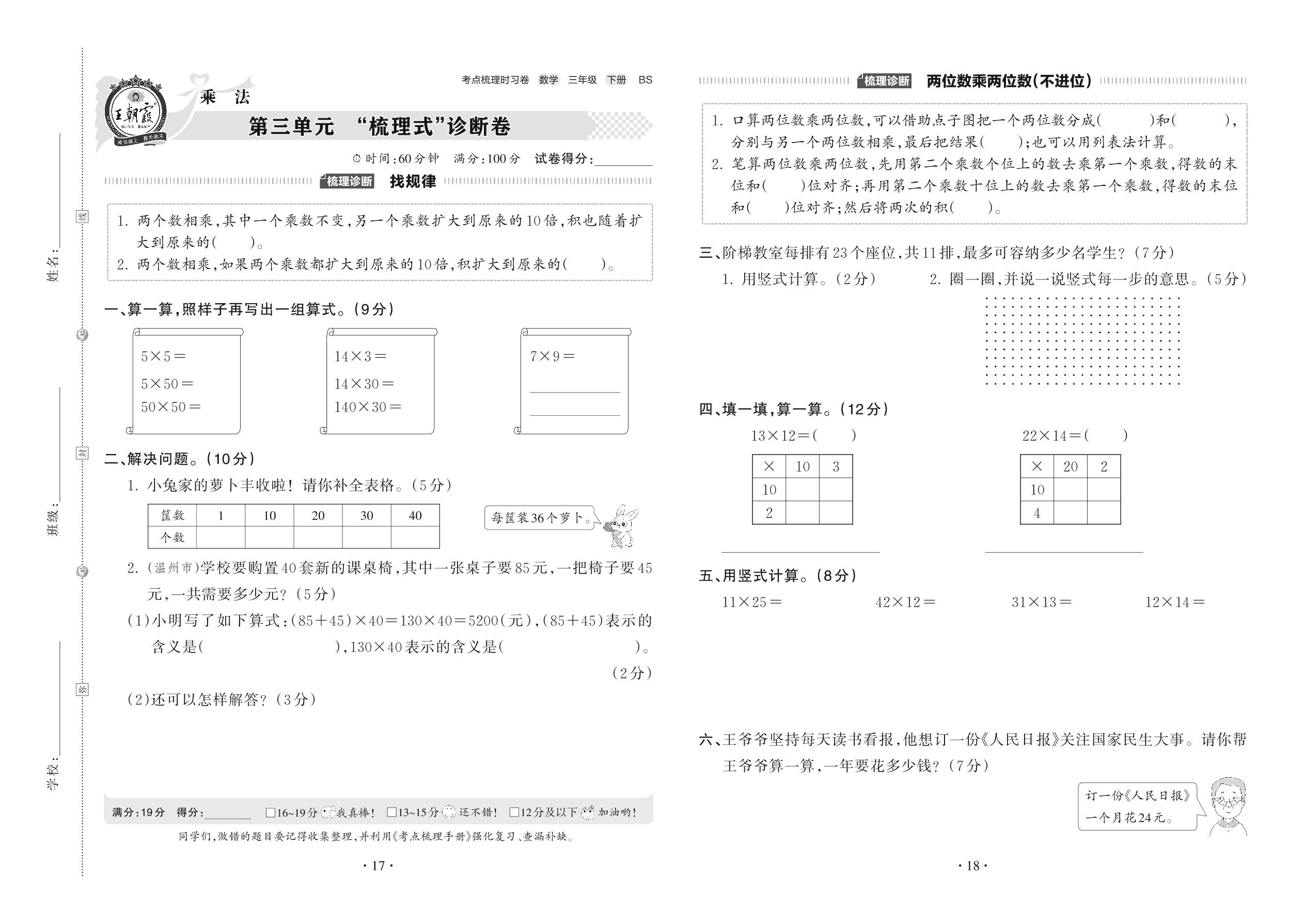 2022下册三年级数学北师版 第三单元 “梳理式”诊断卷