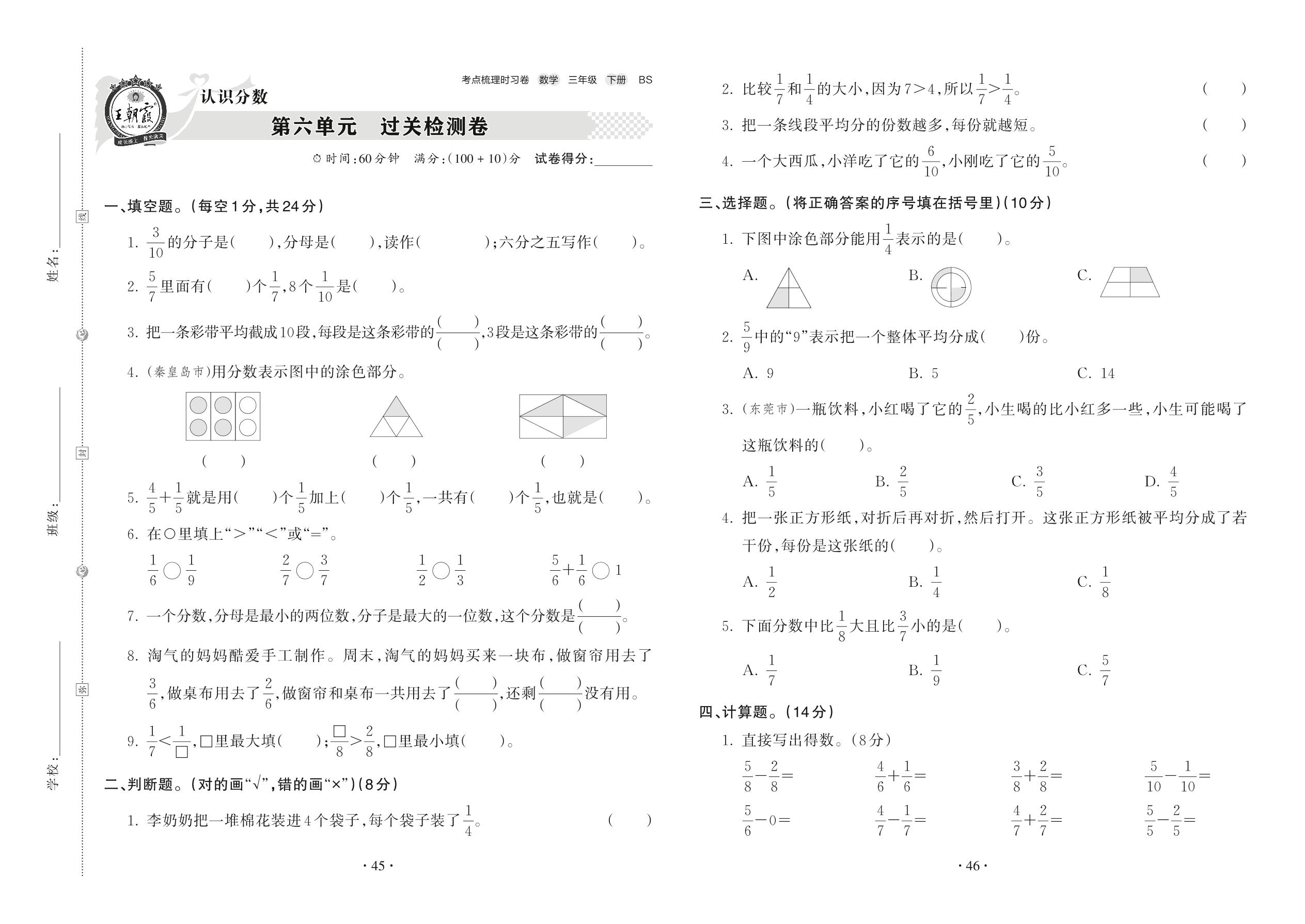 2022下册三年级数学北师版 第六单元 过关检测卷