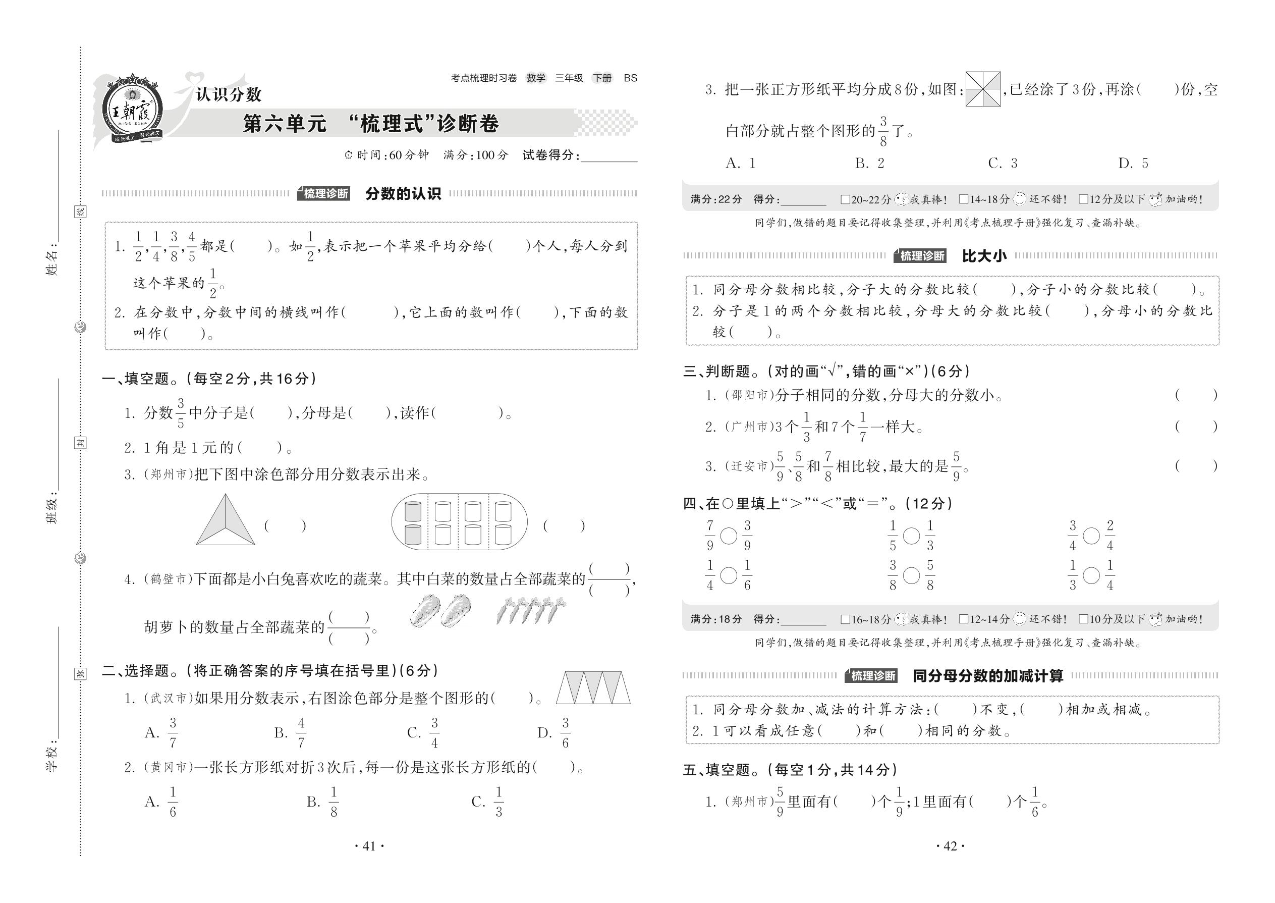2022下册三年级数学北师版 第六单元 “梳理式”诊断卷