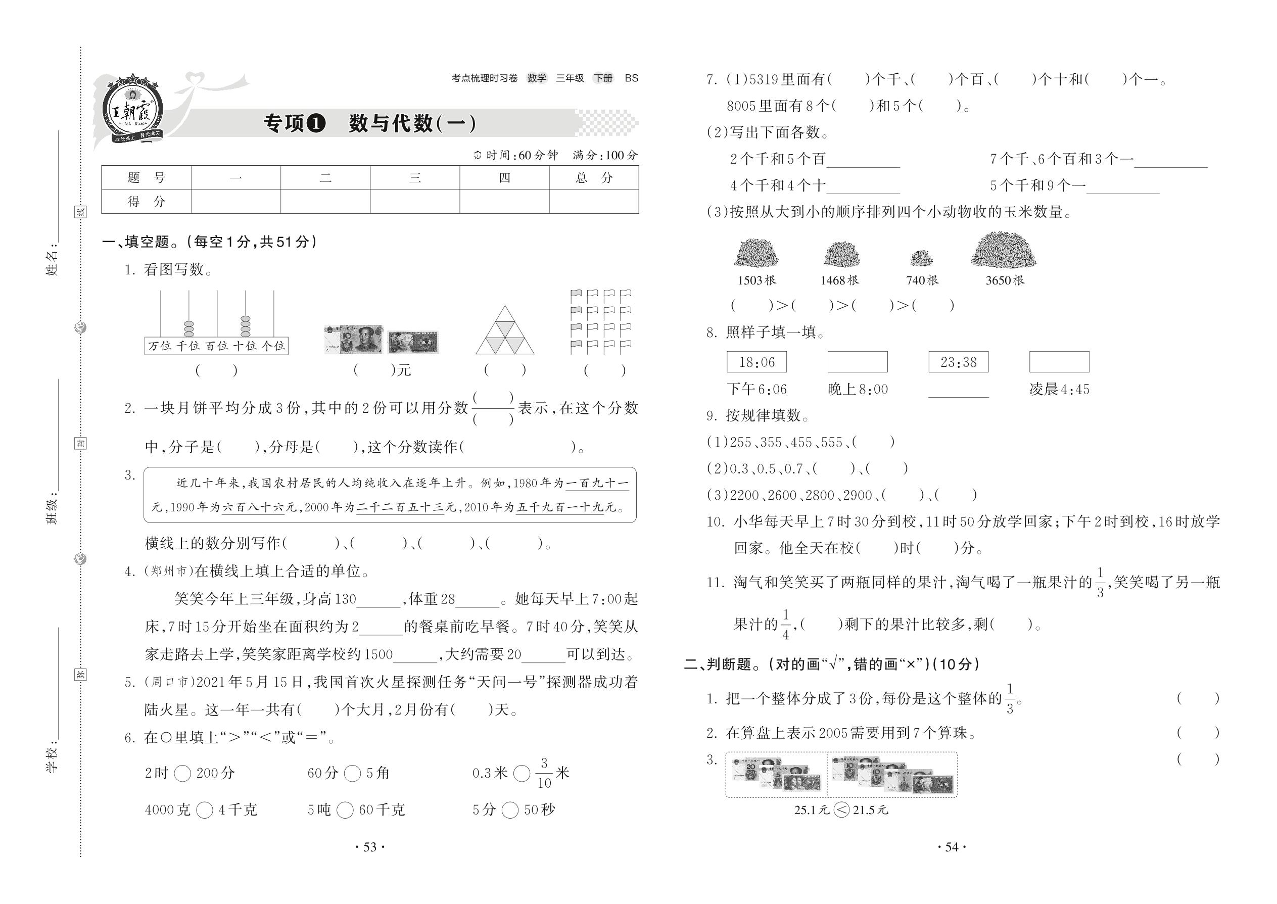 三年级数学北师版下册专项卷
