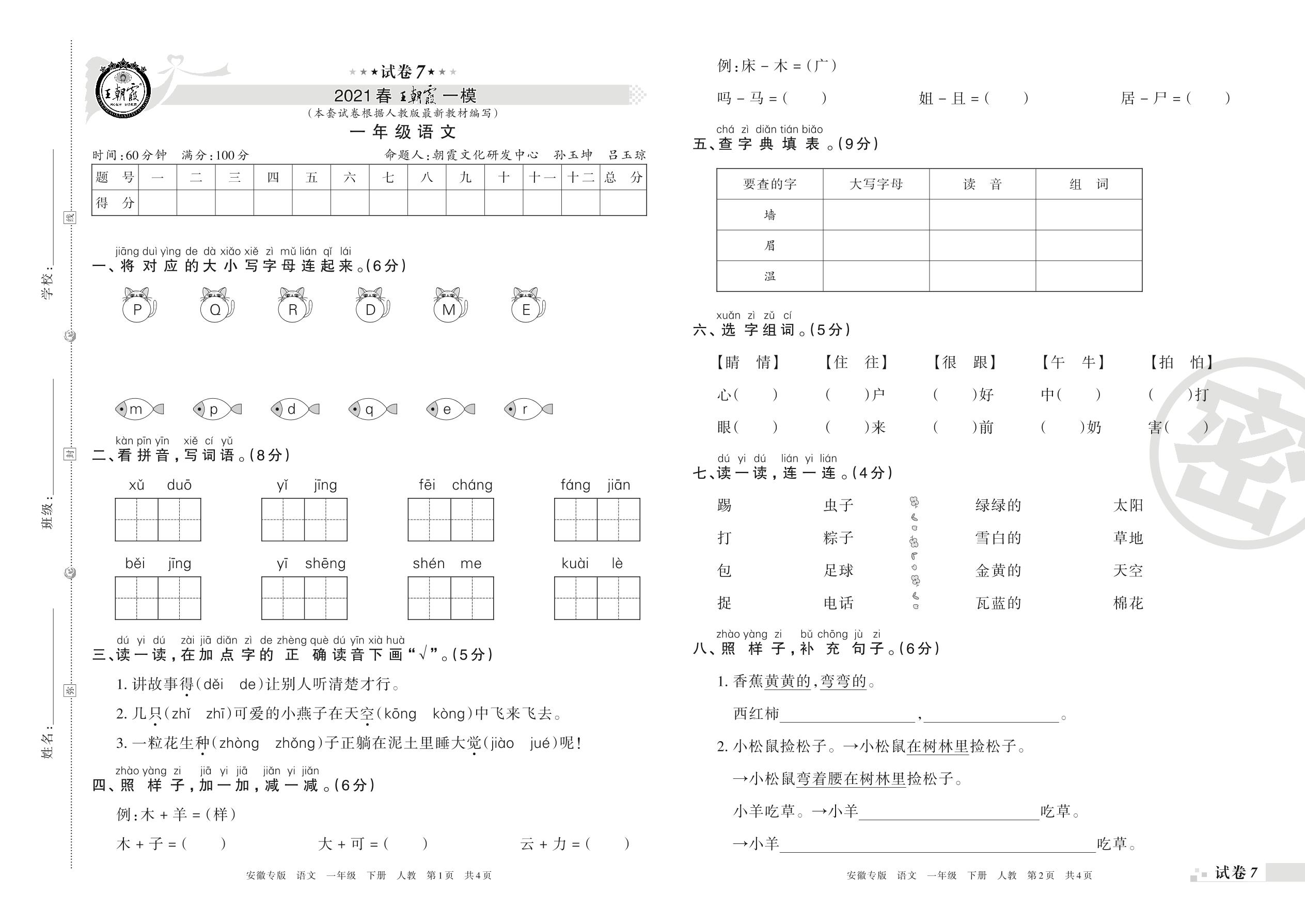 王朝霞期末模拟卷一年级下册语文(人教版)_R210731173041【7】