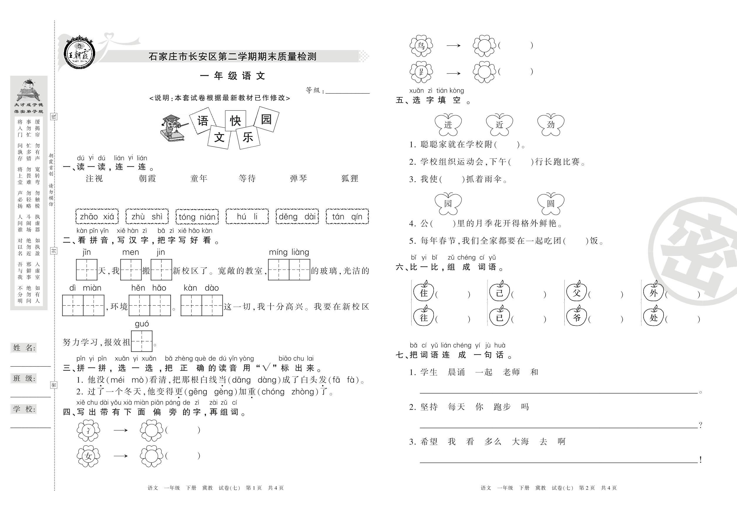 一年级语文冀教版下册期末卷