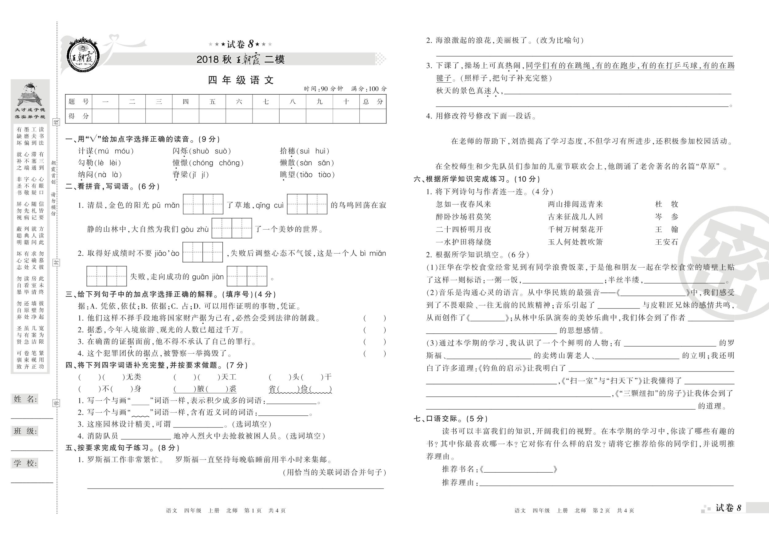 王朝霞期末模拟卷四年级上册语文(北师版)【8】