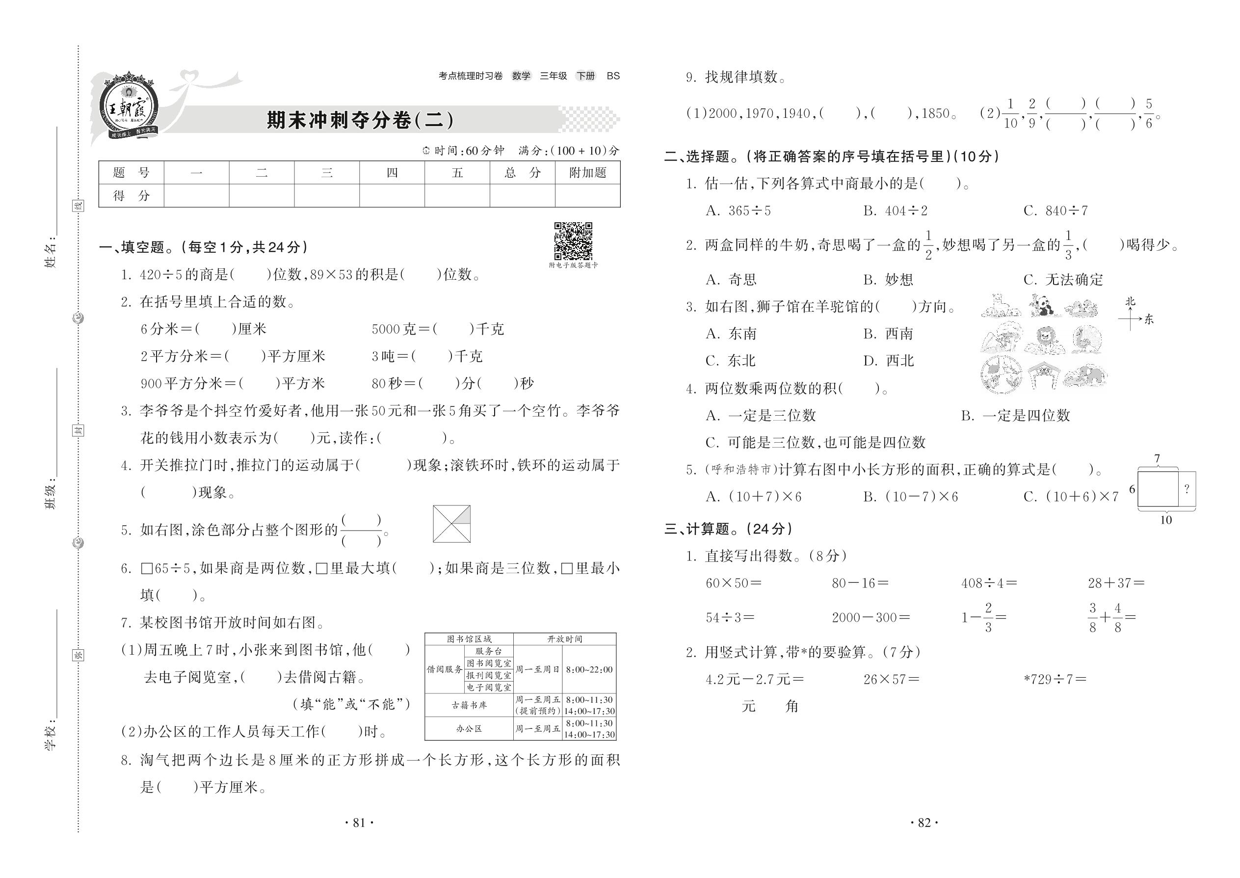 2022下册三年级数学北师版 期末冲刺夺分卷(二)