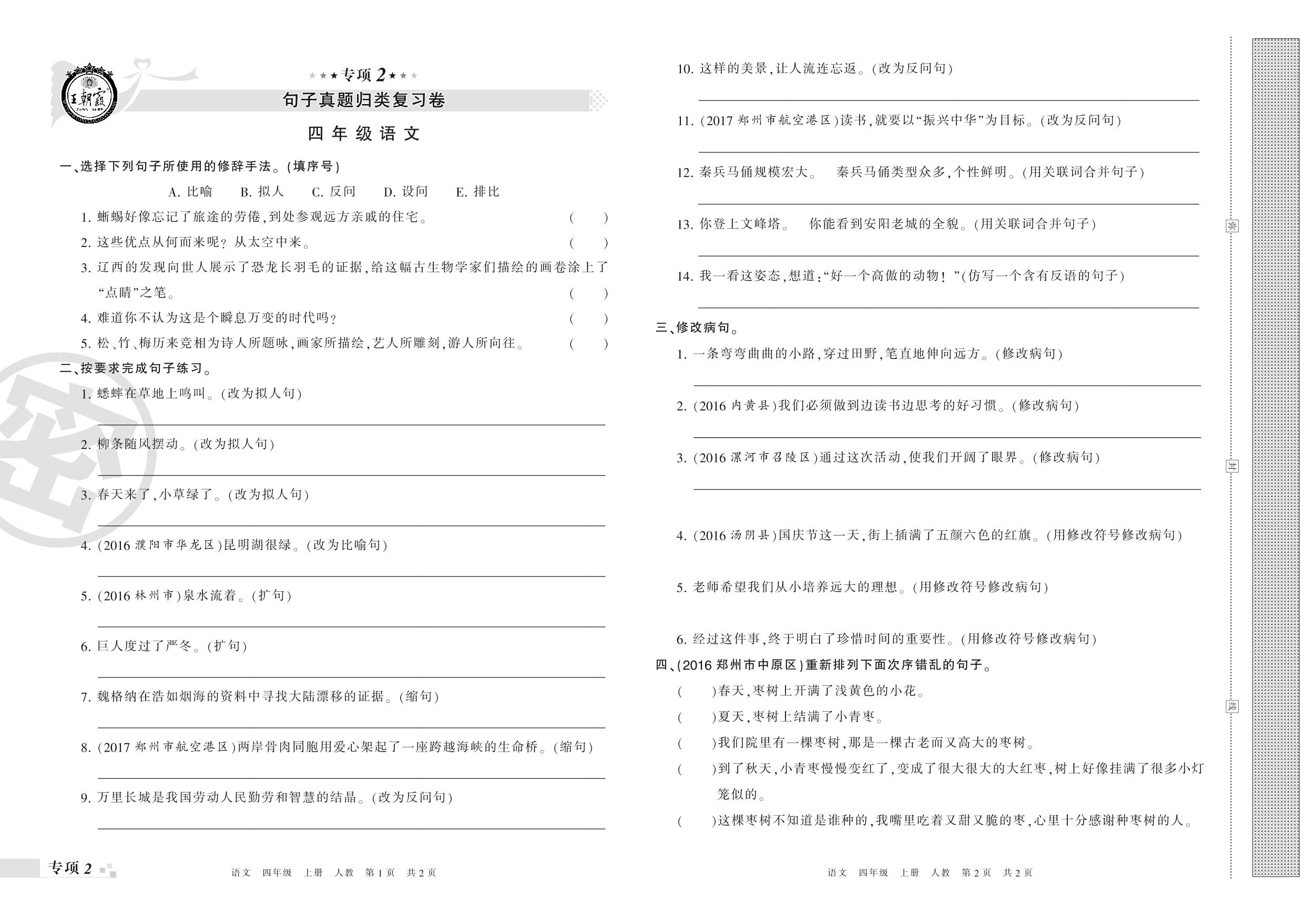 王朝霞期末专项卷——句子真题归类复习四年级上册语文(人教版)【0】