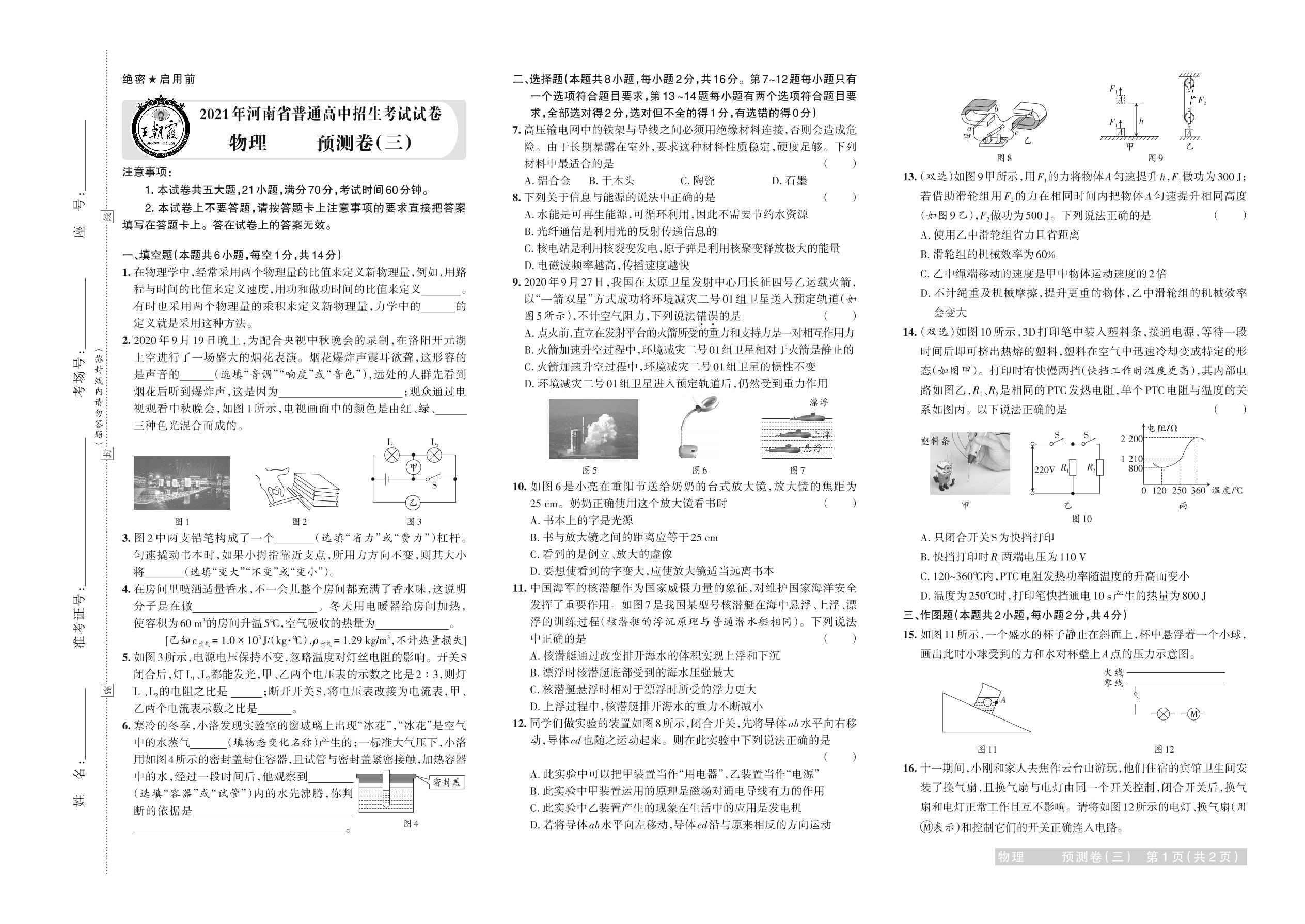 2021年河南省普通高中招生考试试卷物理·预测卷(三)