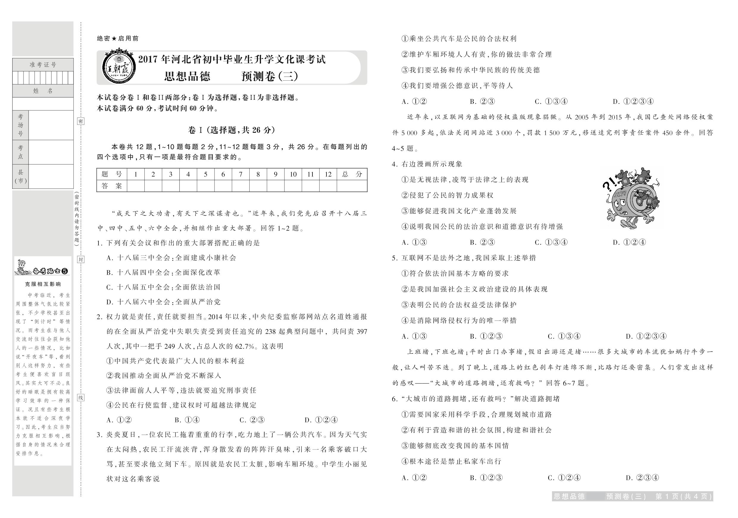 2017年河北省普通高中招生考试试卷道德与法治·预测卷(三)