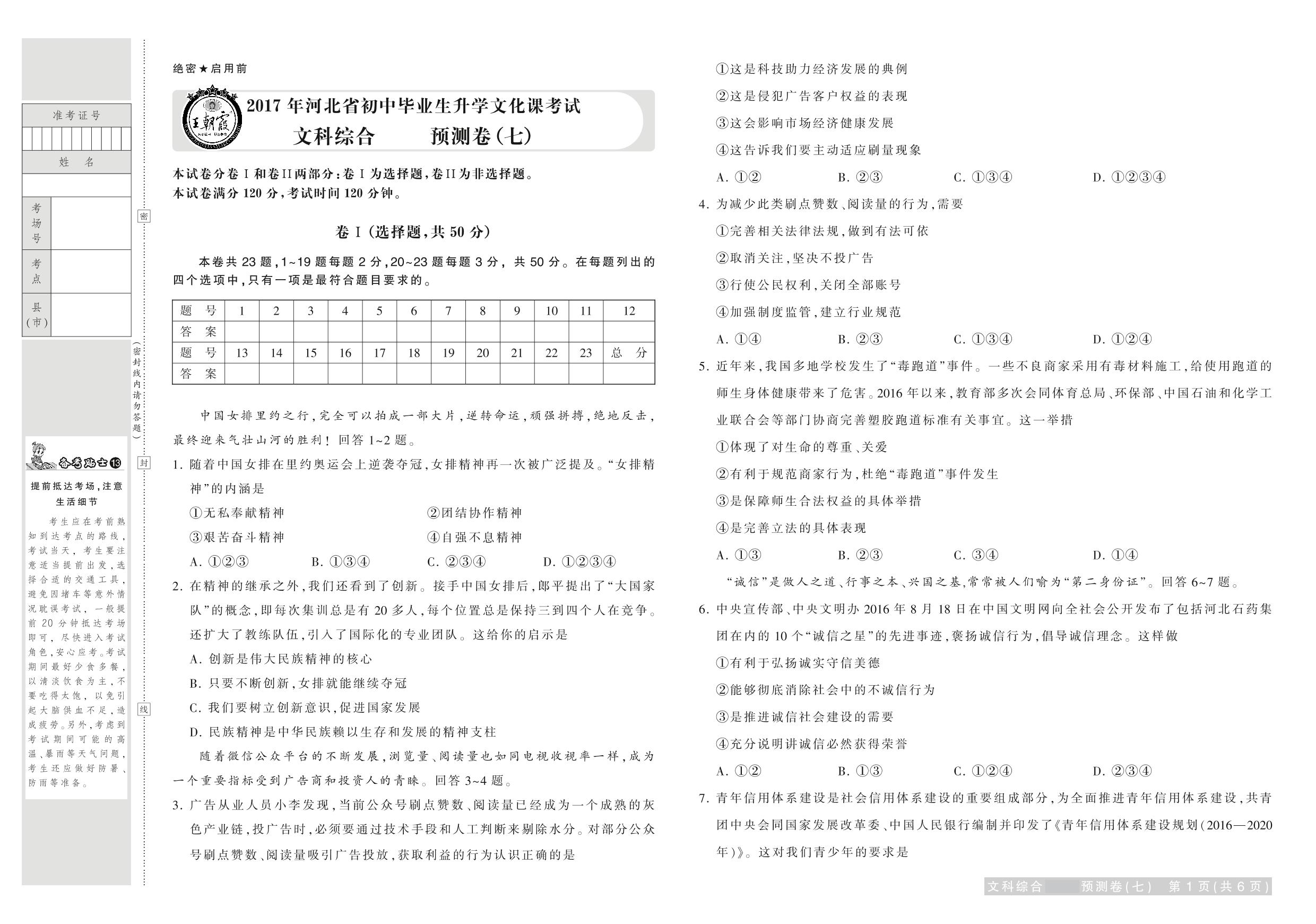 2017年河北省普通高中招生考试试卷道德与法治·预测卷(七)