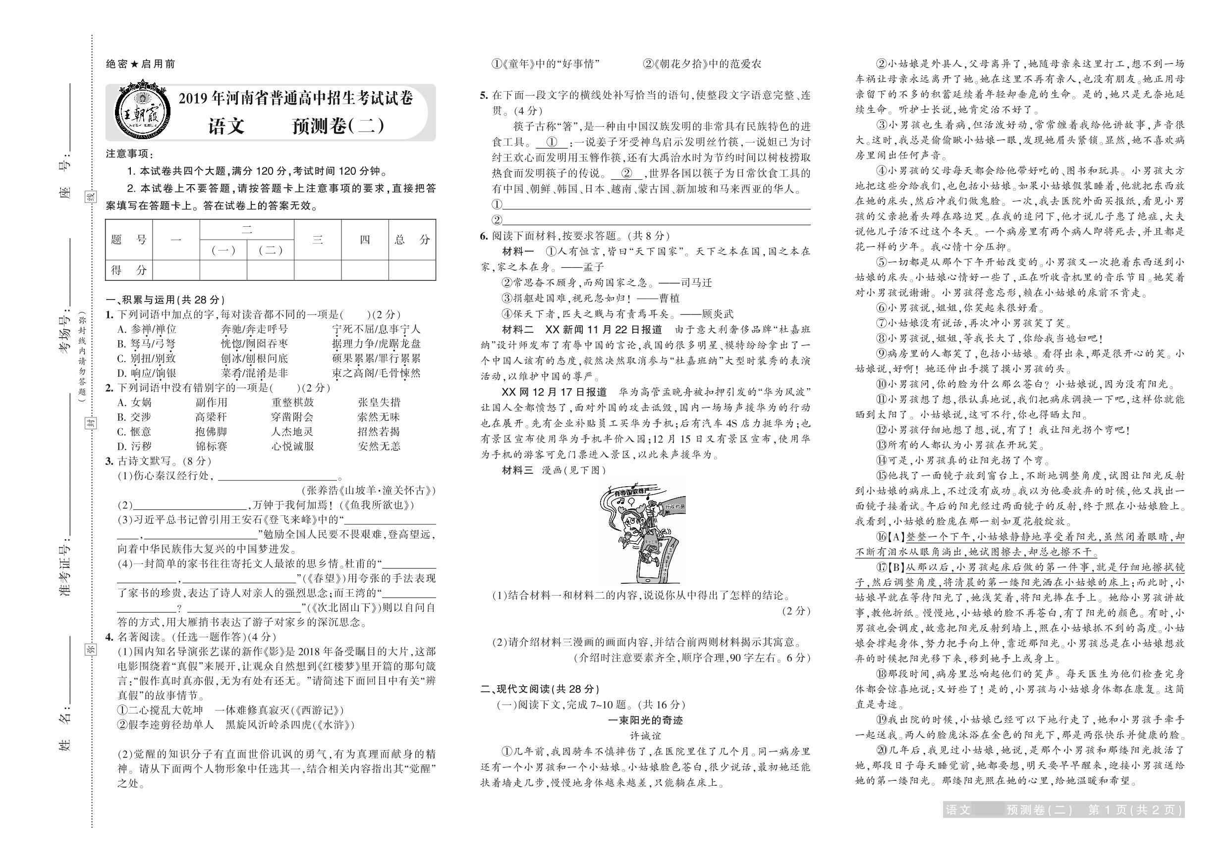 2019年河南省普通高中招生考试试卷语文·预测卷(二)