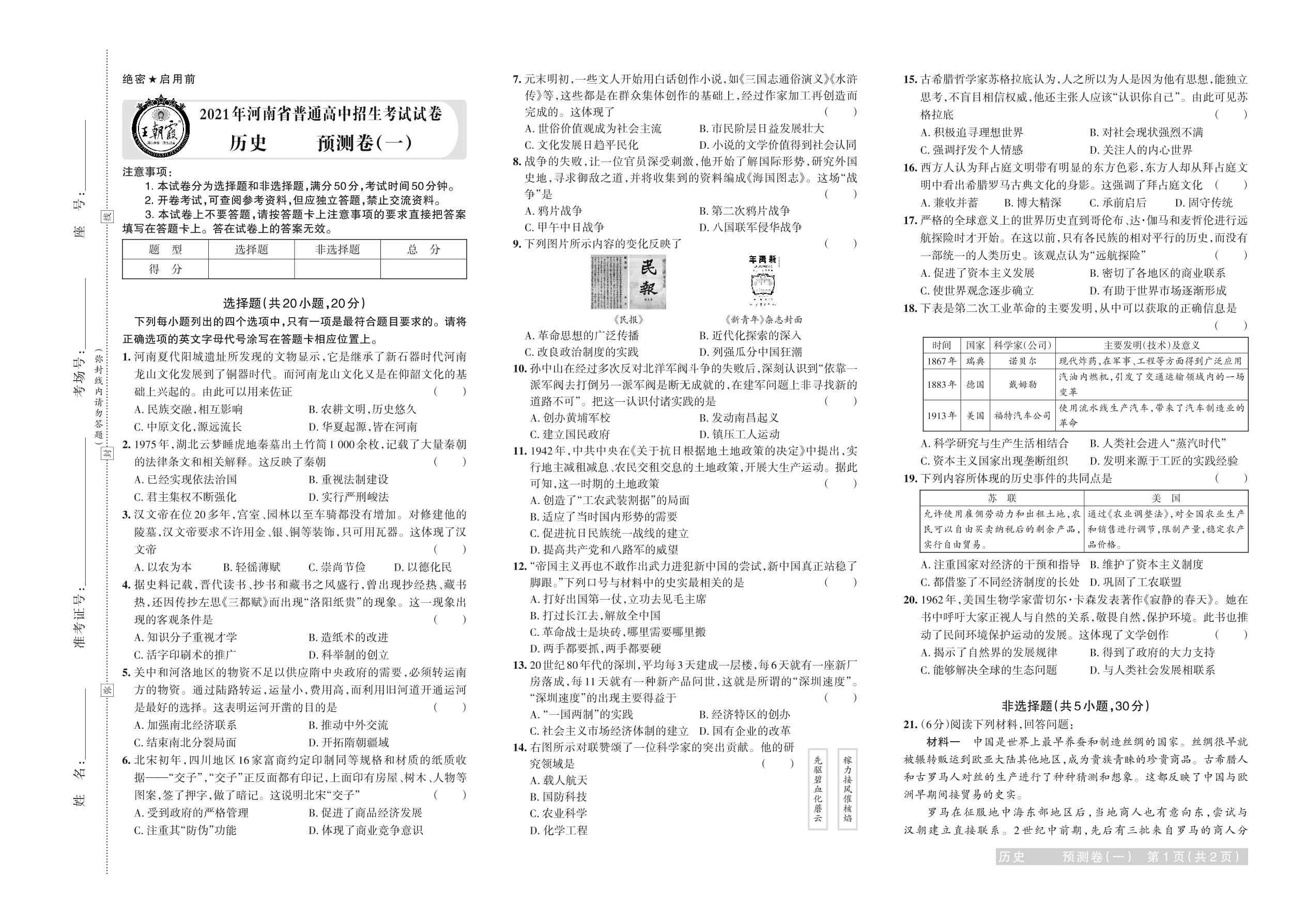 2021年河南省普通高中招生考试试卷历史·预测卷(一)