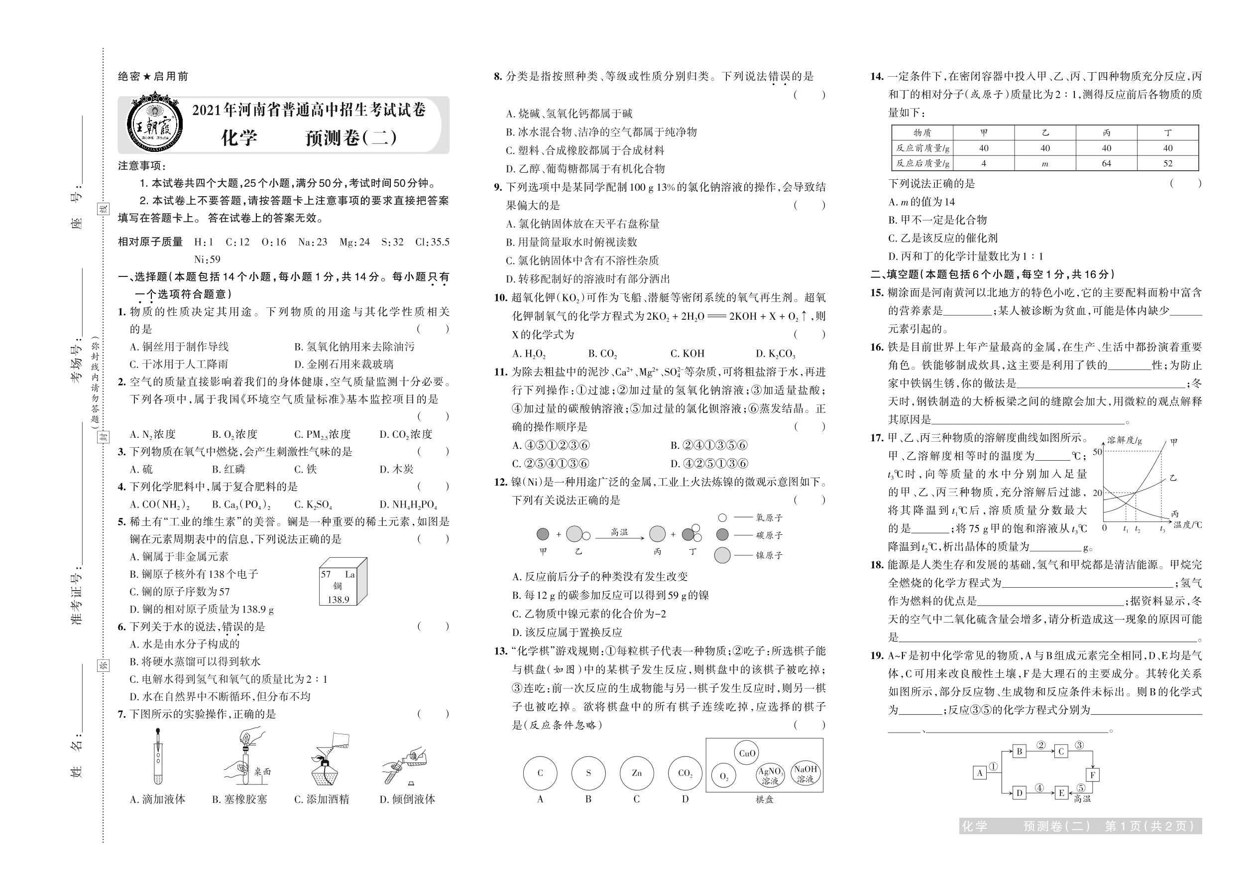 2021年河南省普通高中招生考试试卷化学·预测卷(二)