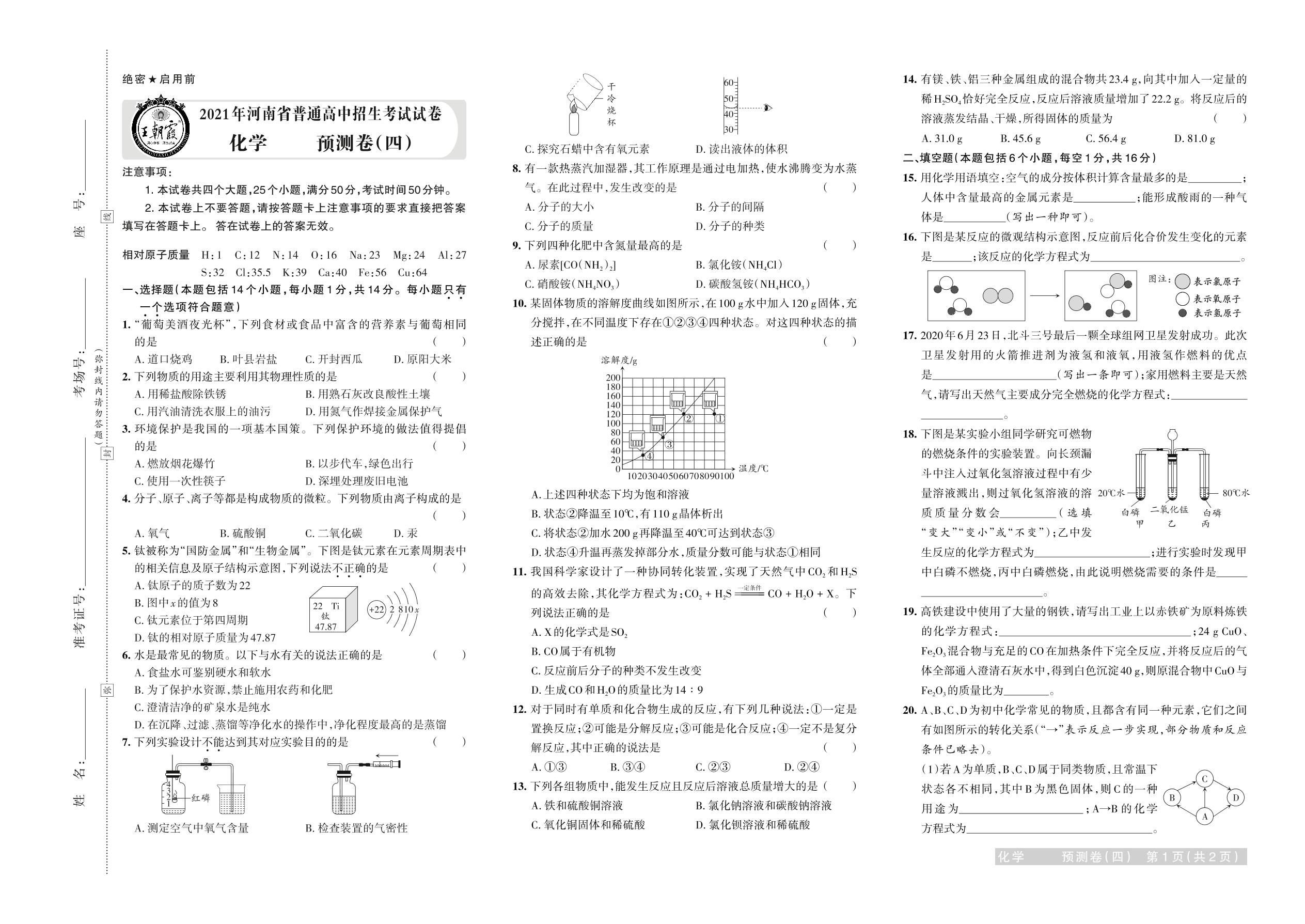 2021年河南省普通高中招生考试试卷化学·预测卷(四)