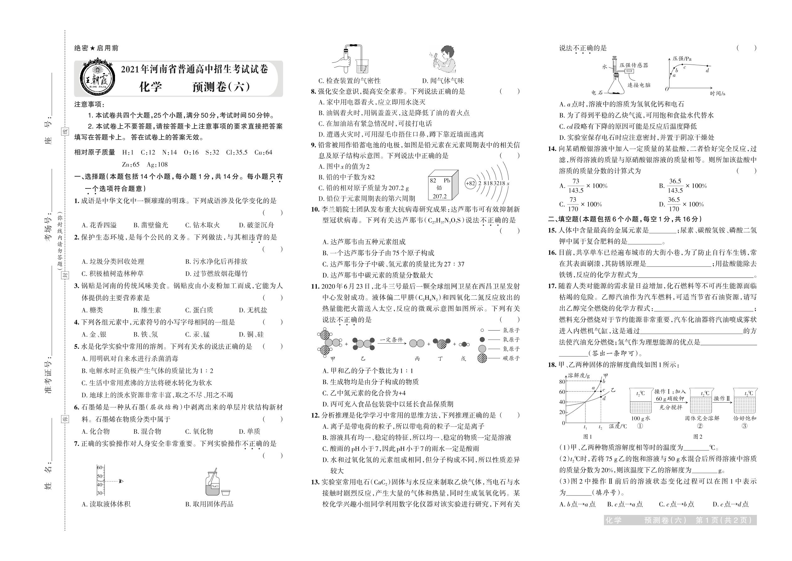 2021年河南省普通高中招生考试试卷化学·预测卷(六)