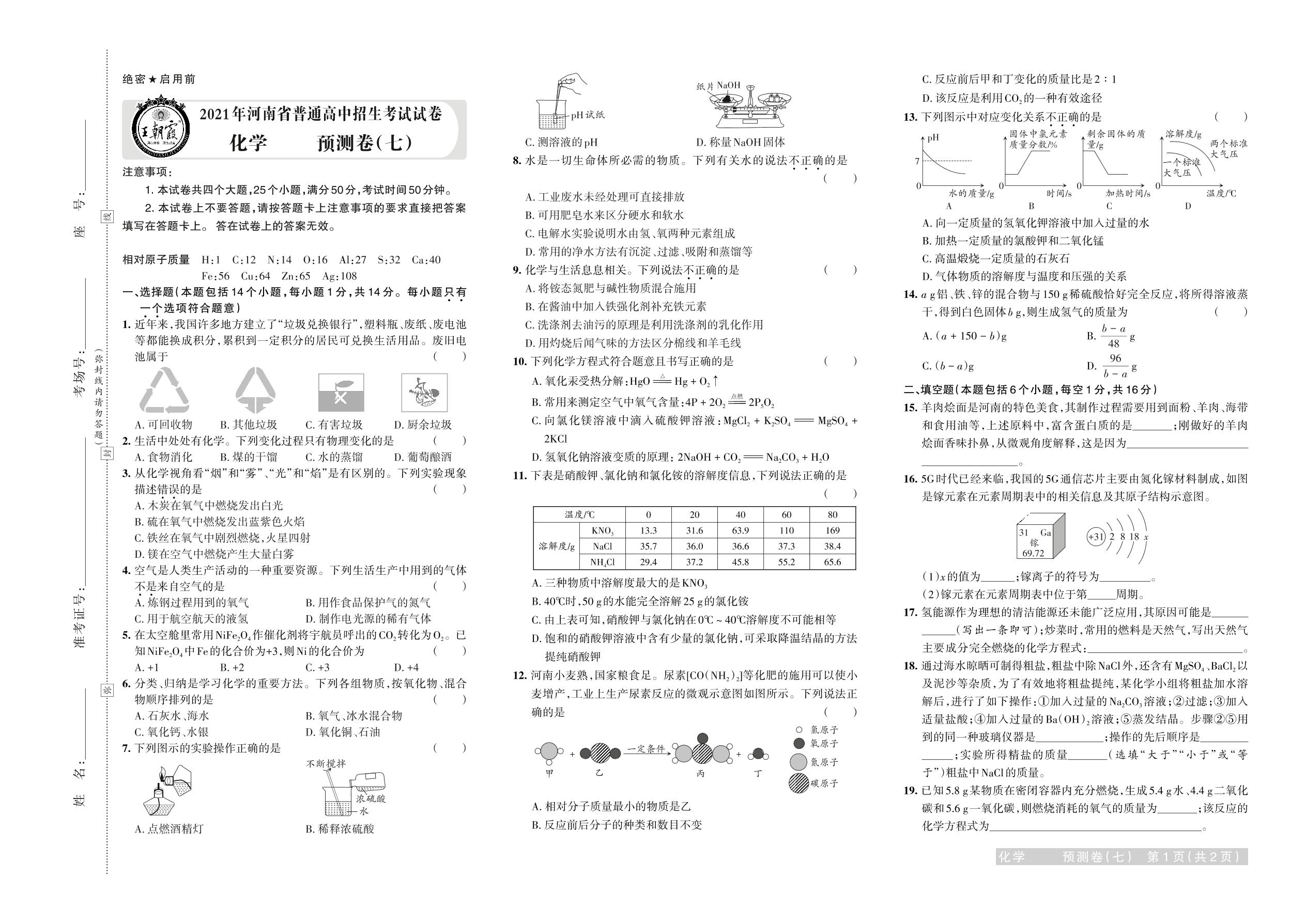 2021年河南省普通高中招生考试试卷化学·预测卷(七)