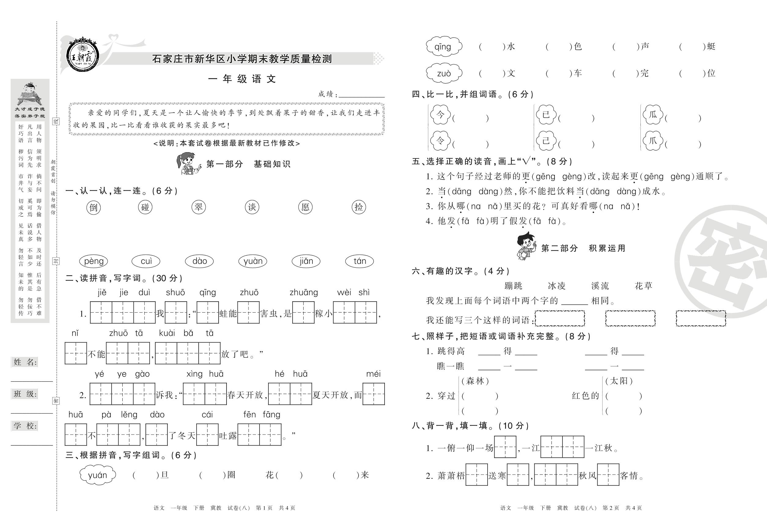 2015-2016学年第二学期石家庄市新华区一年级语文试卷(冀教版)【8】