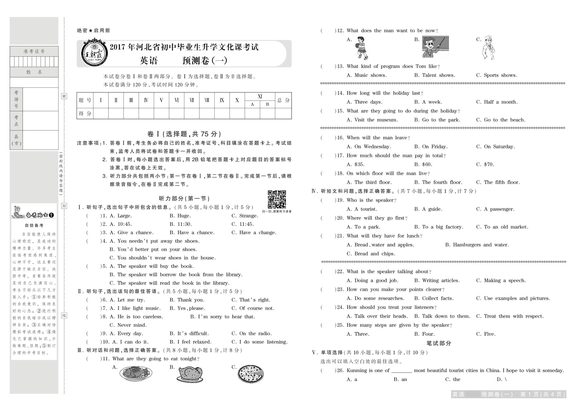2017年河北省普通高中招生考试试卷英语·预测卷(一)