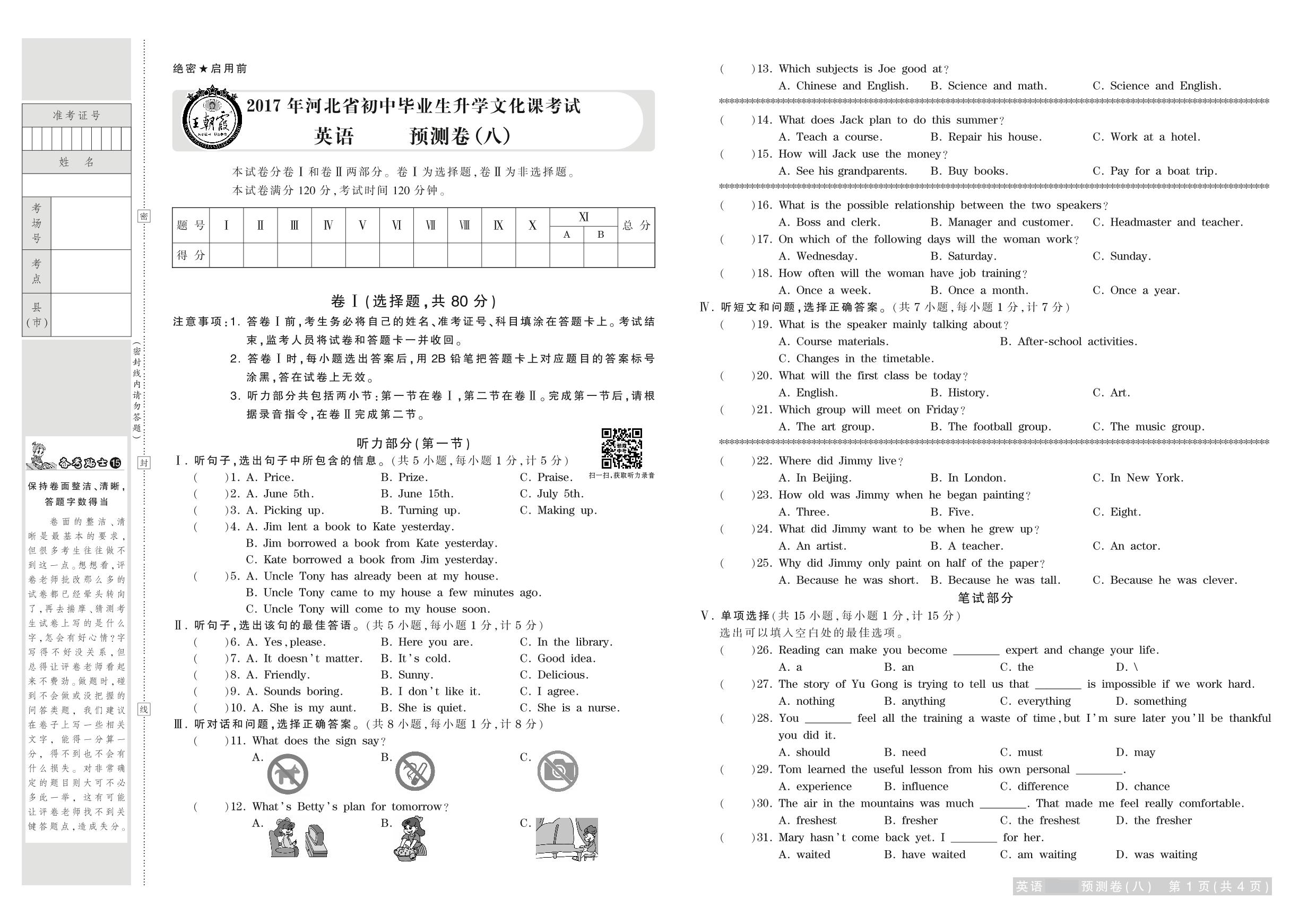 2017年河北省普通高中招生考试试卷英语·预测卷(八)