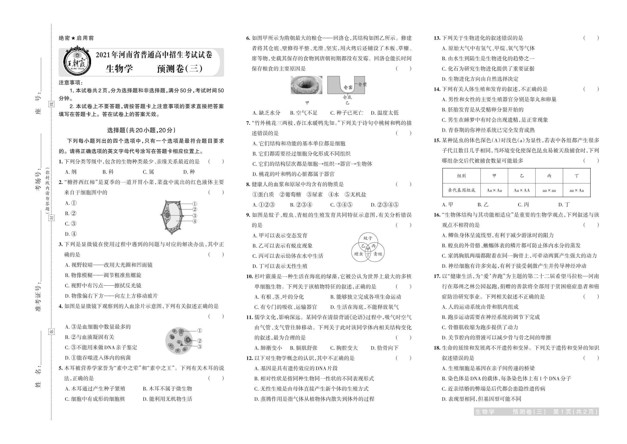 2021年河南省普通高中招生考试试卷生物学·预测卷(三)