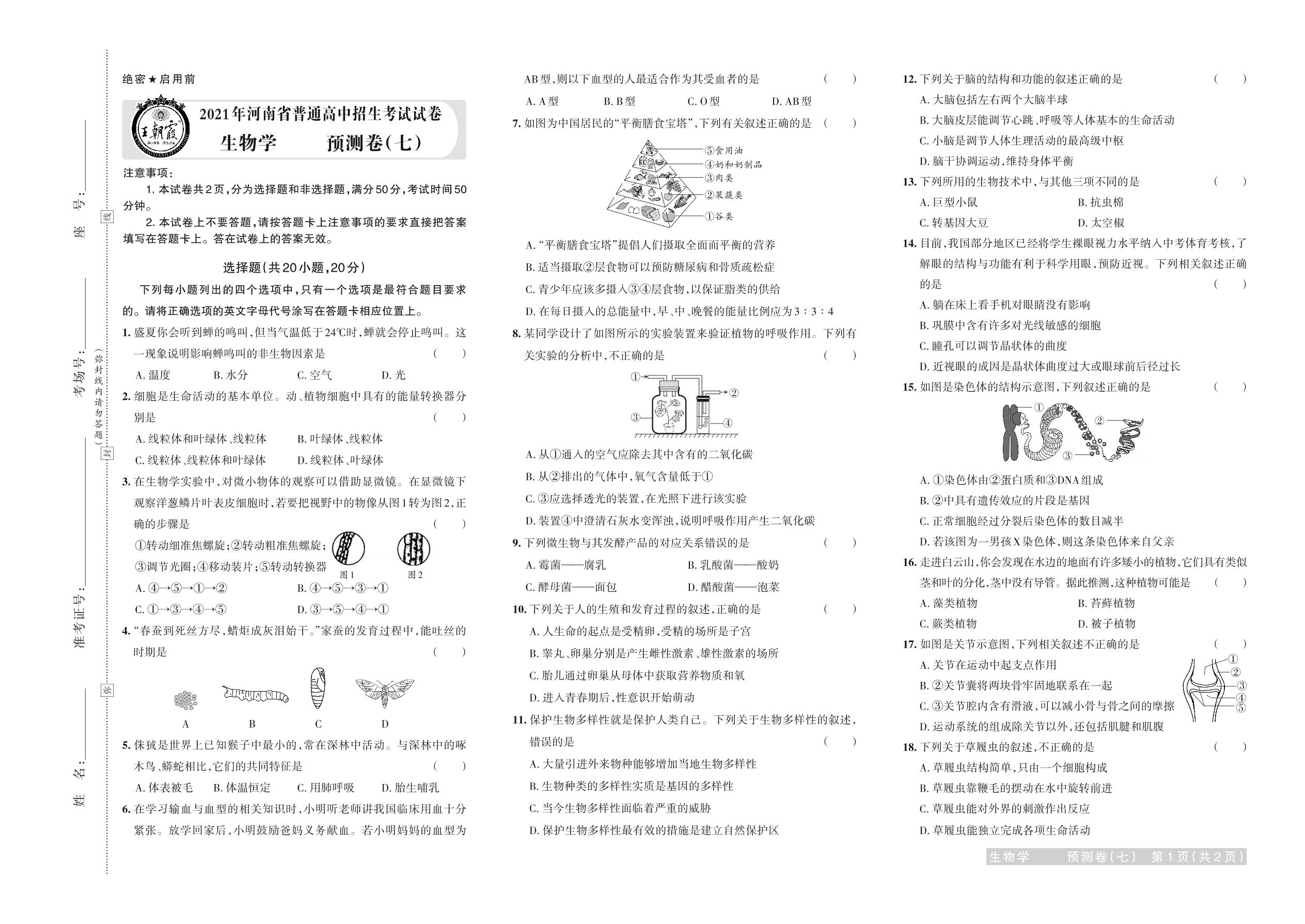 2021年河南省普通高中招生考试试卷生物学·预测卷(七)