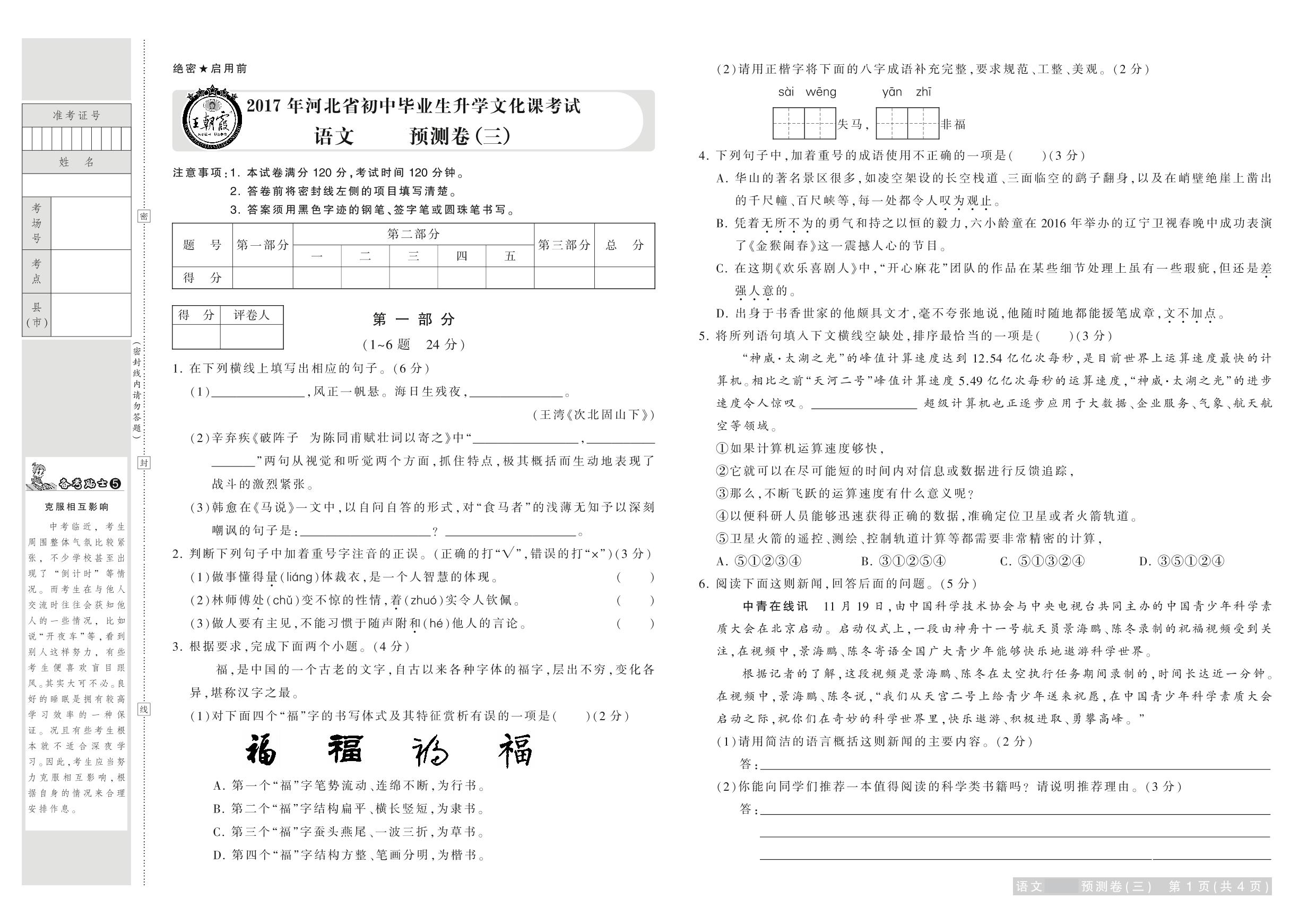2017年河北省普通高中招生考试试卷语文·预测卷(三)