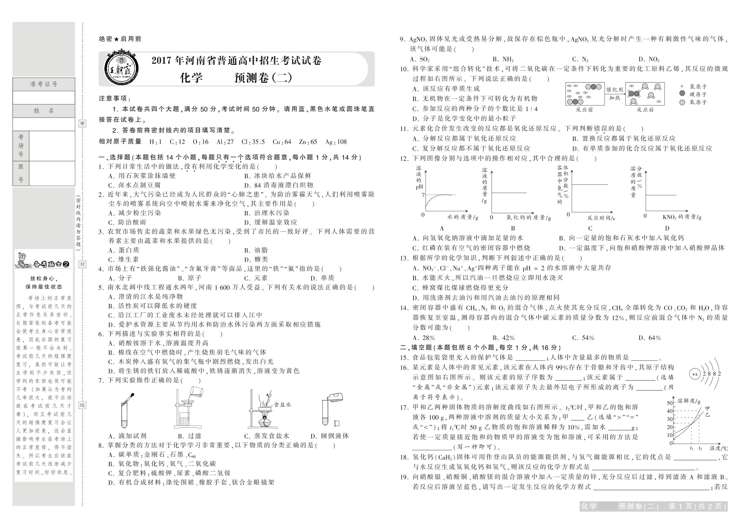 2017年河南省普通高中招生考试试卷化学·预测卷(二)