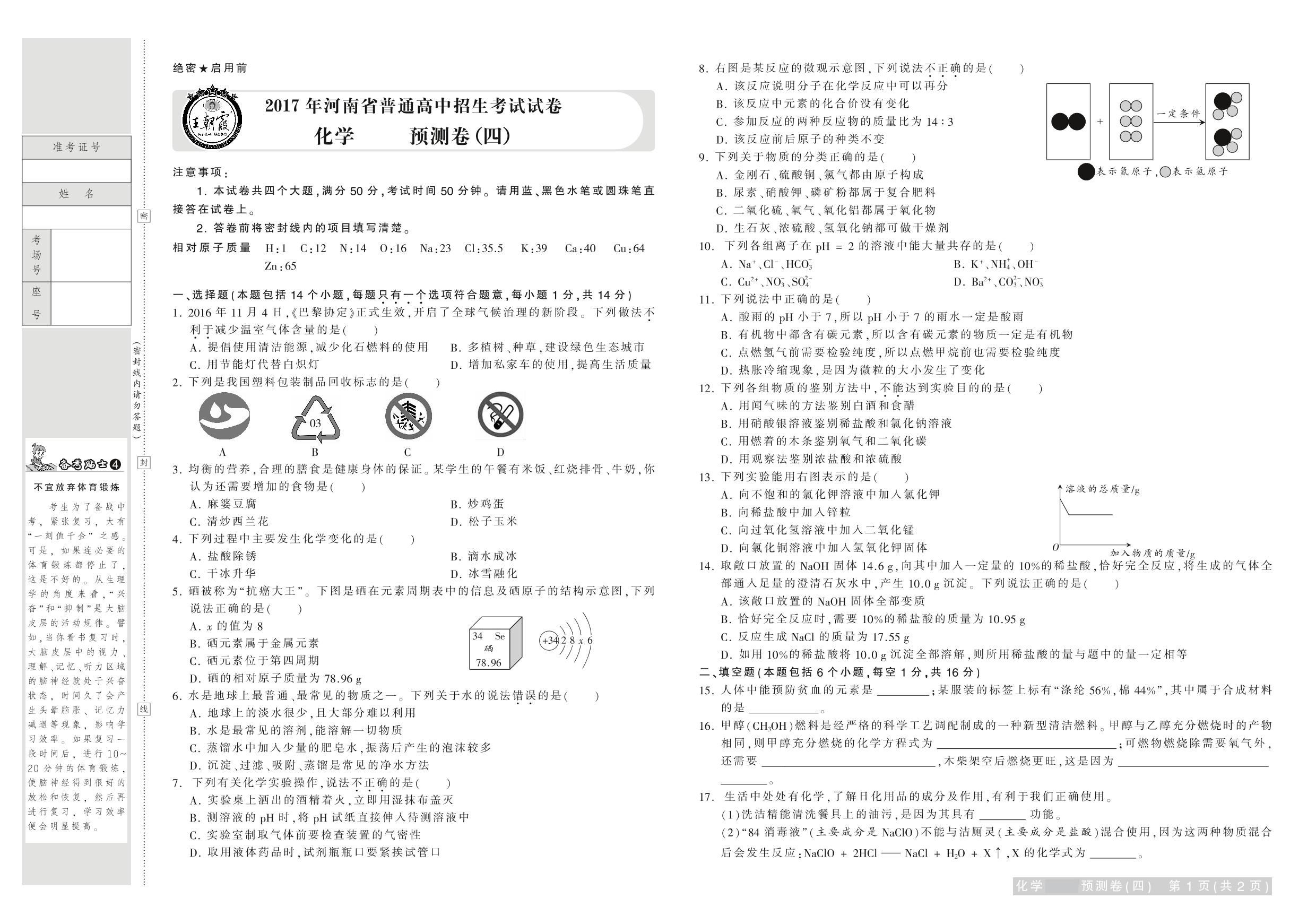 2017年河南省普通高中招生考试试卷化学·预测卷(四)