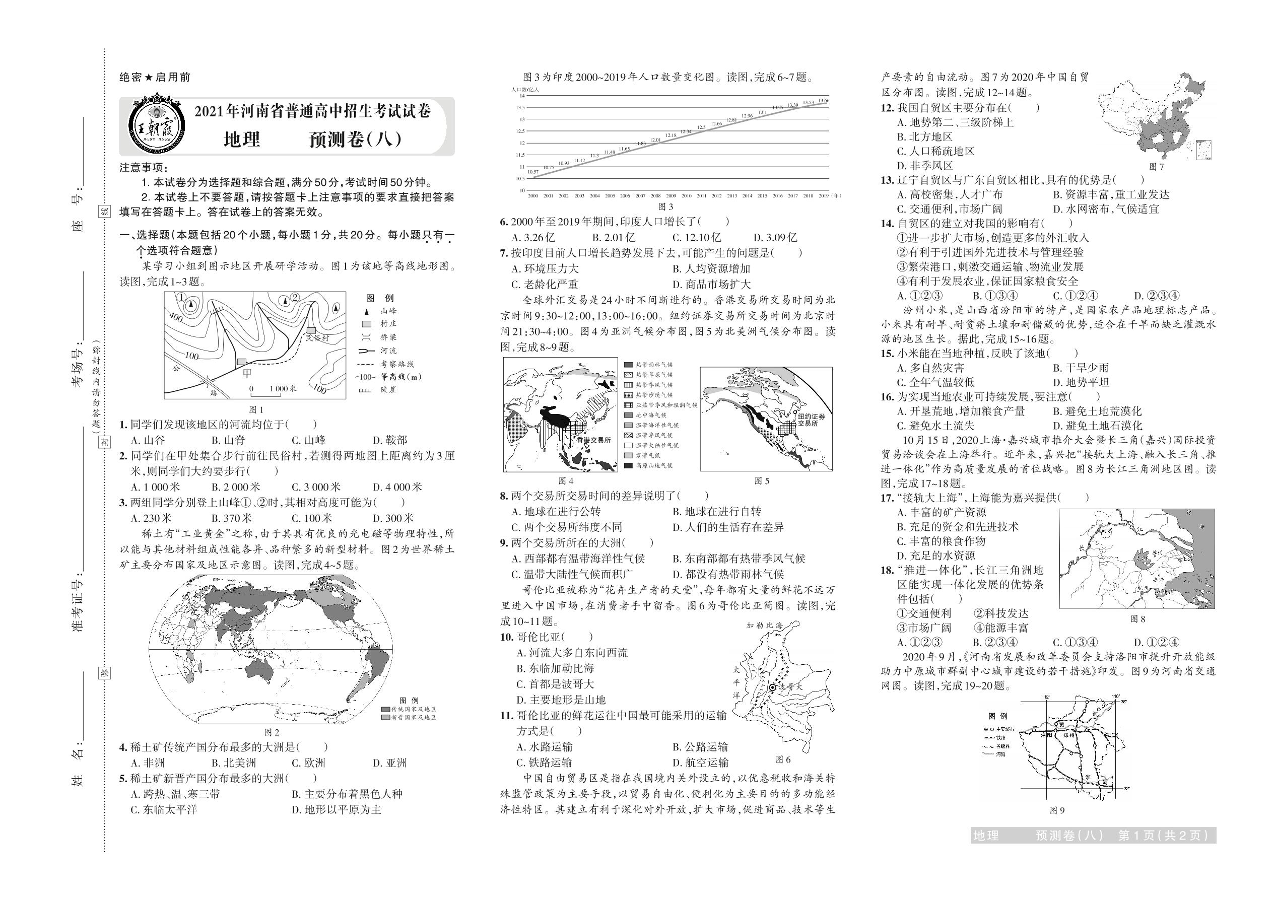 2021年河南省普通高中招生考试试卷地理·预测卷(八)