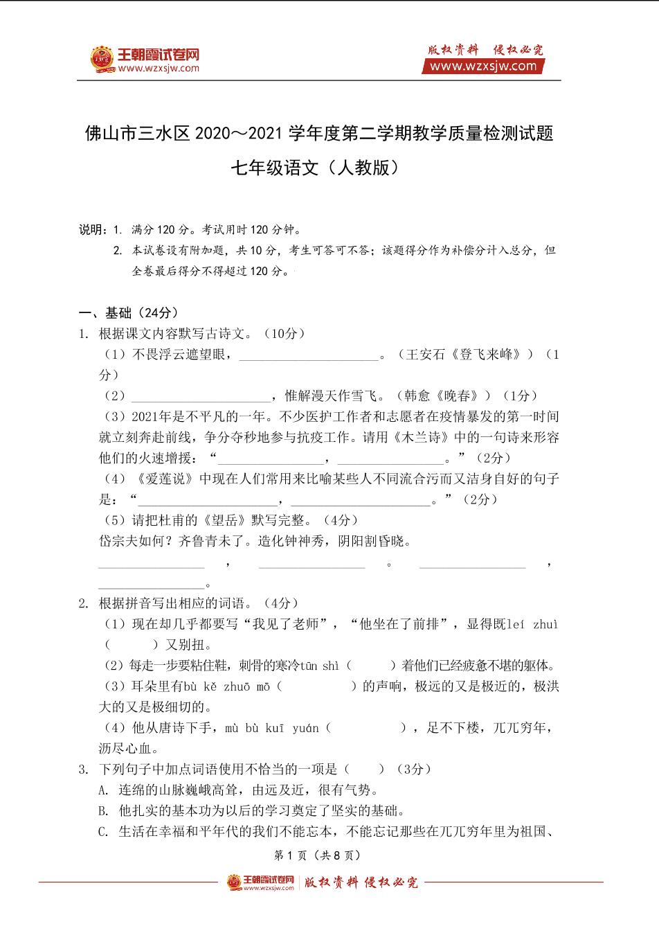佛山市三水区2020~2021学年度第二学期教学质量检测七年级语文试题(人教版)