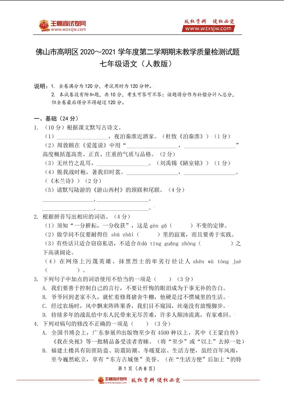 佛山市高明区2020~2021学年度第二学期期末教学质量检测七年级语文试题(人教版)