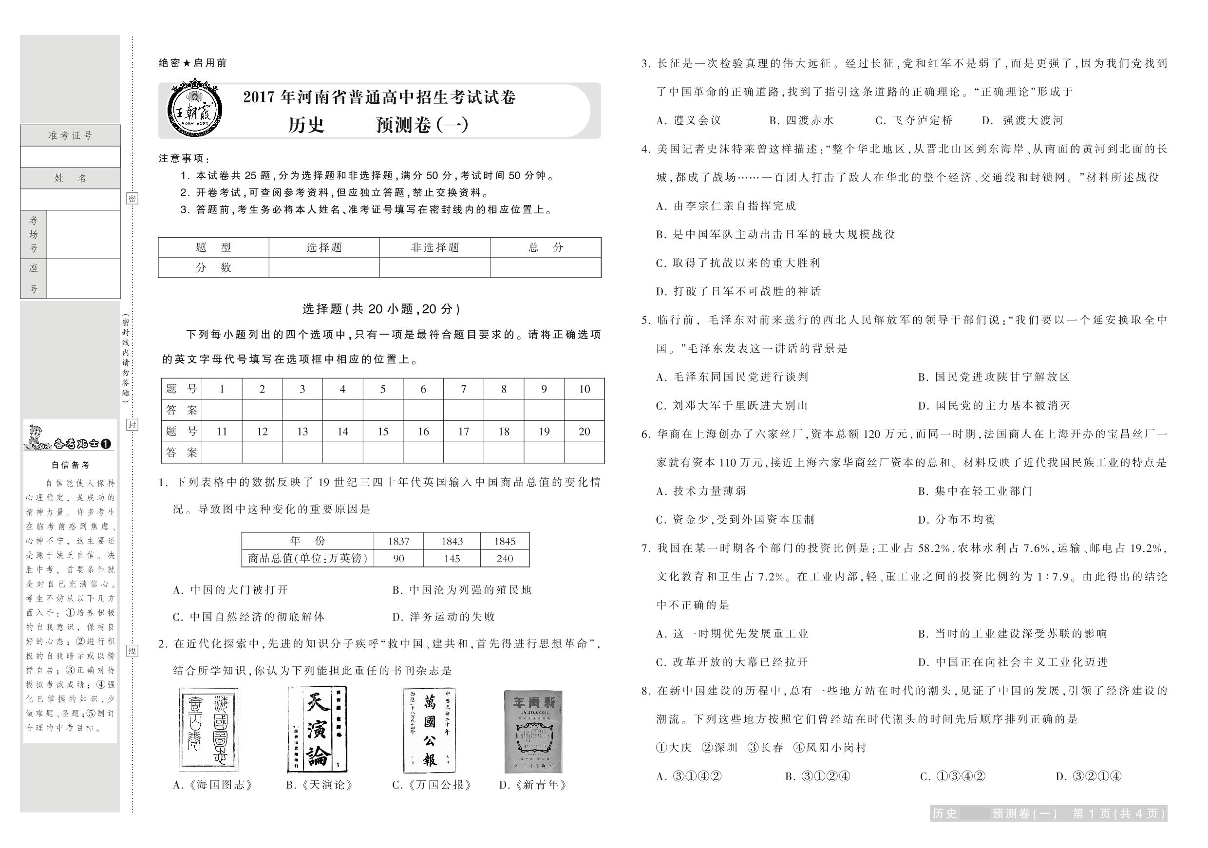 2017年河南省普通高中招生考试试卷历史·预测卷(一)