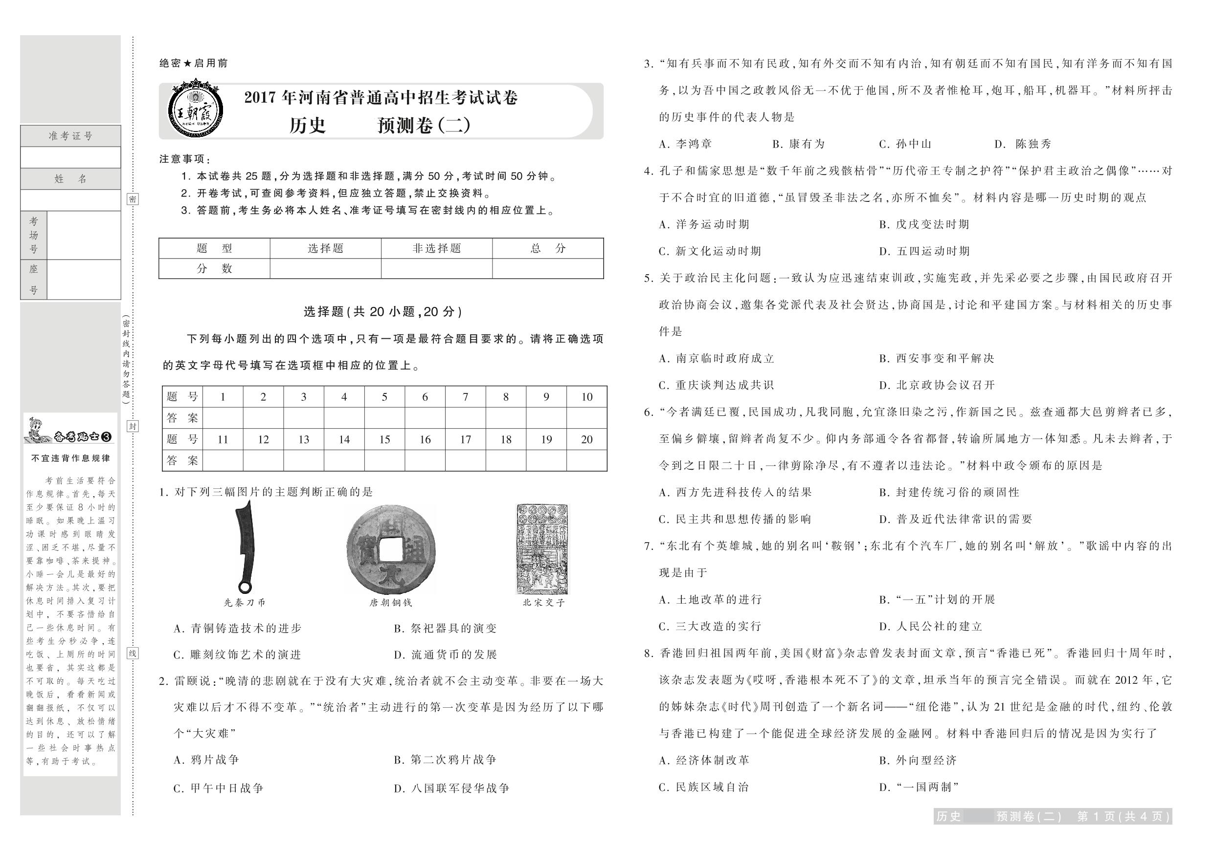 2017年河南省普通高中招生考试试卷历史·预测卷(二)