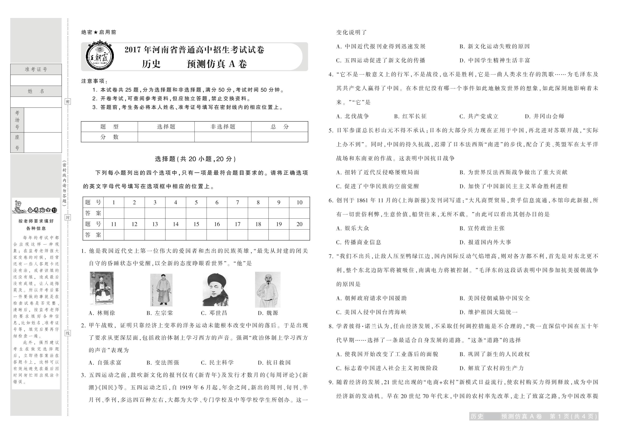 2017年河南省普通高中招生考试试卷历史·预测仿真A卷