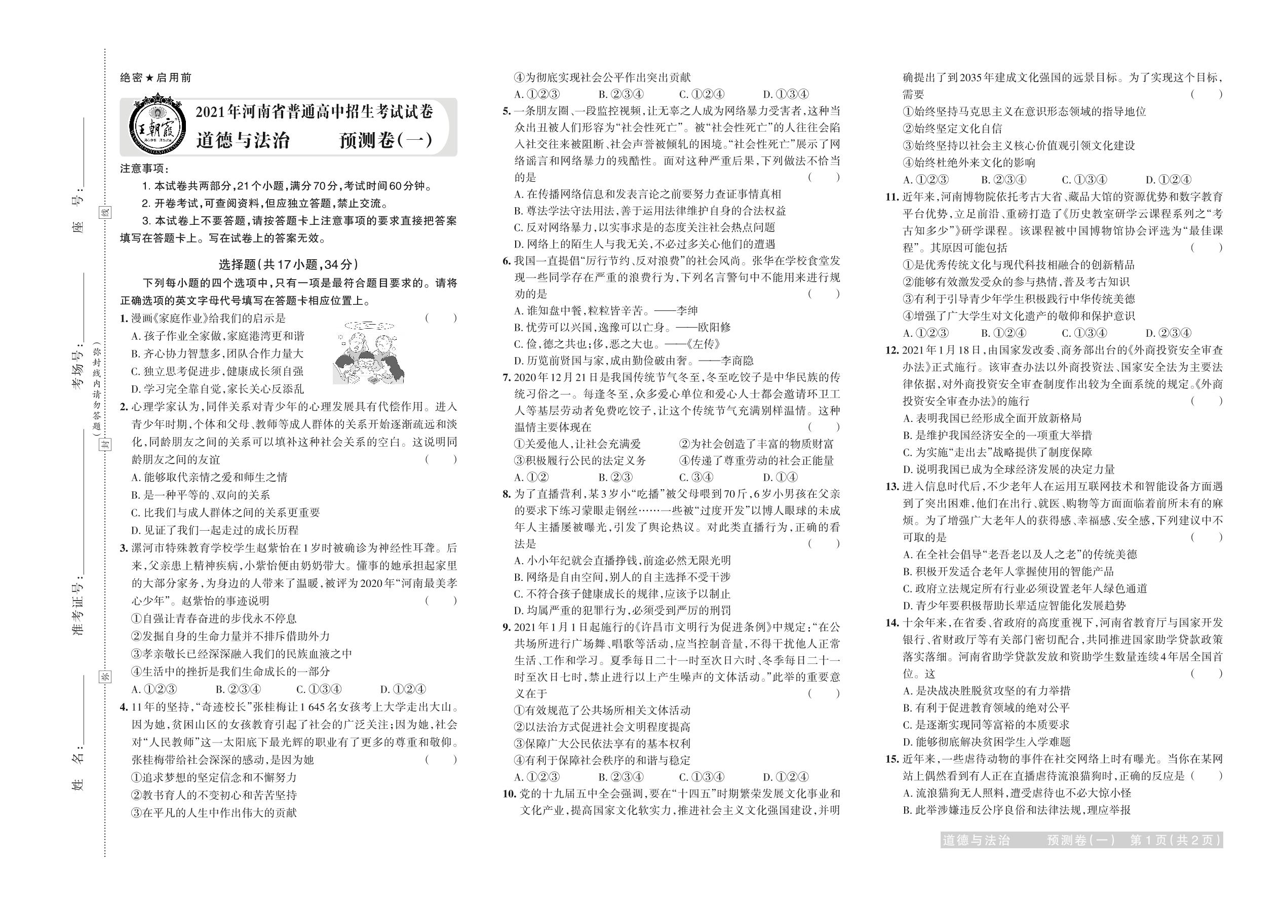 2021年河南省普通高中招生考试试卷道德与法治·预测卷(一)