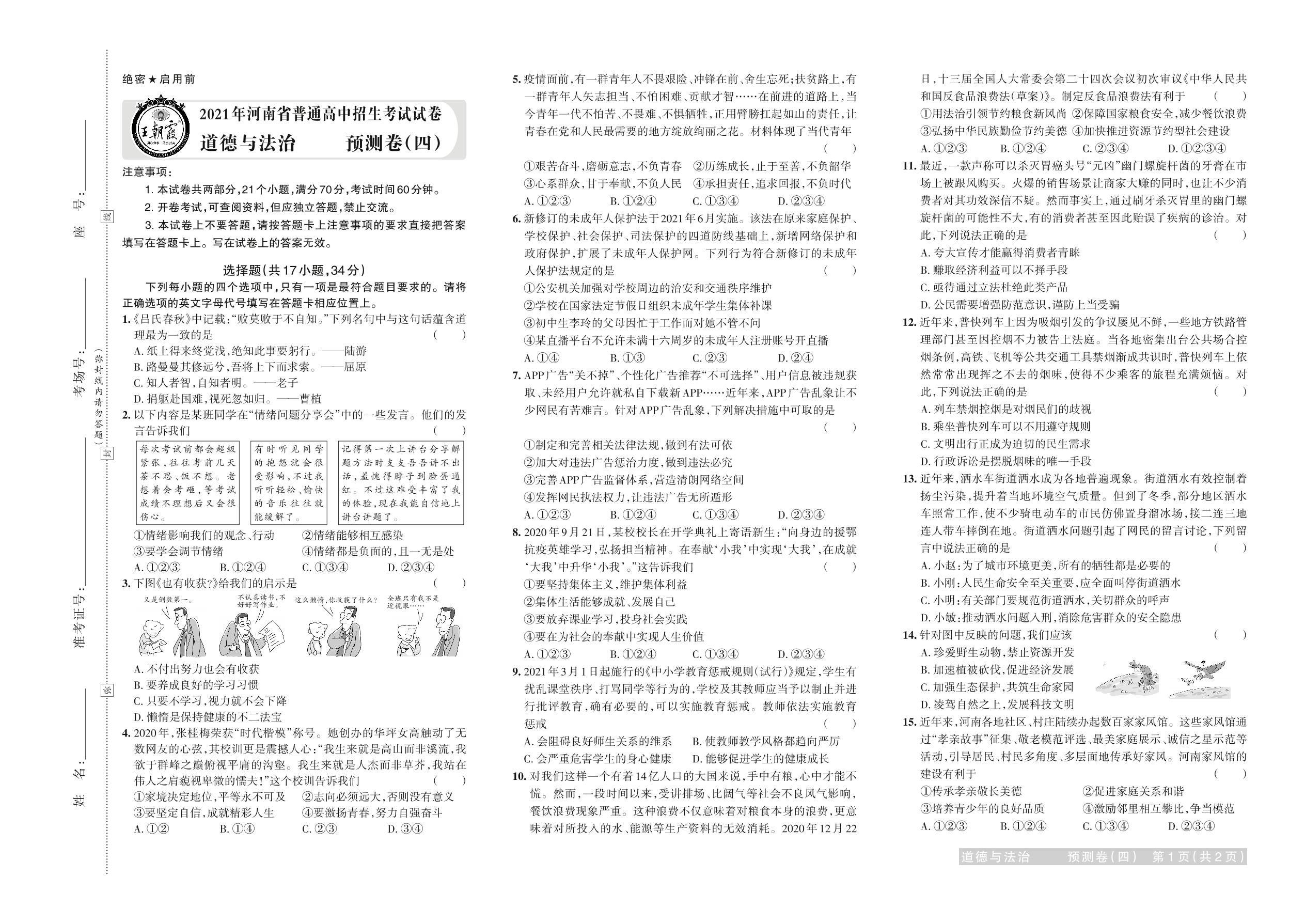 2021年河南省普通高中招生考试试卷道德与法治·预测卷(四)