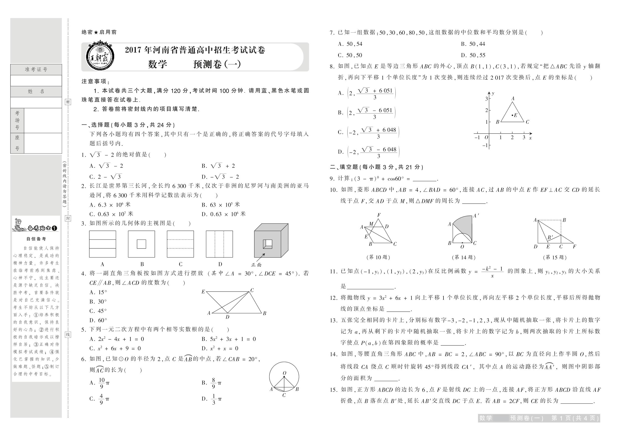 2017年河南省普通高中招生考试试卷数学·预测卷(一)