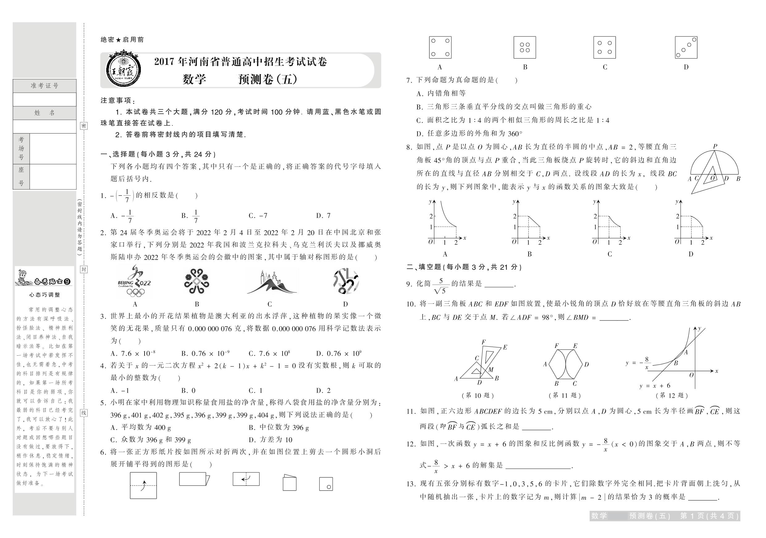 2017年河南省普通高中招生考试试卷数学·预测卷(五)
