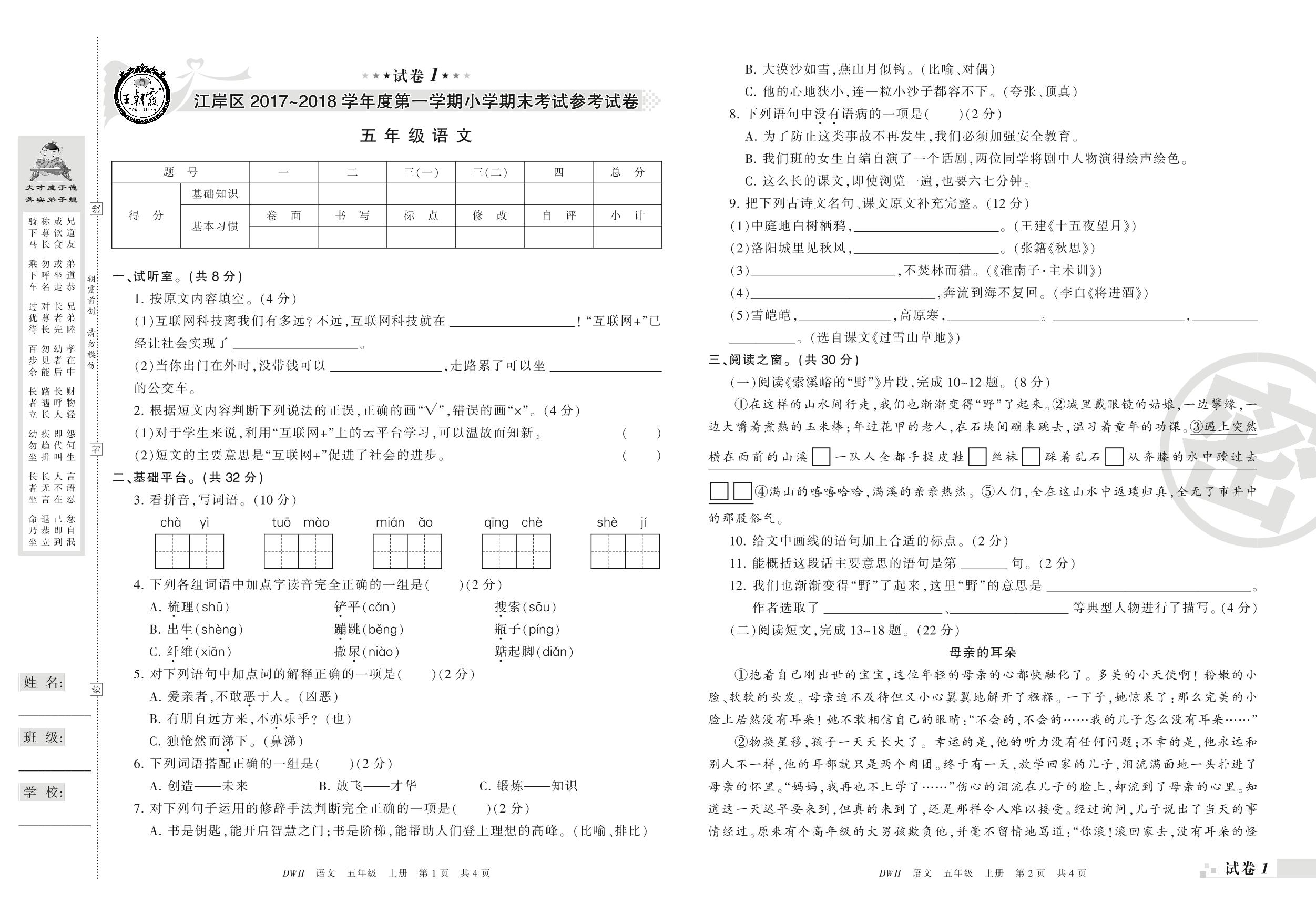 2017-2018学年第一学期武汉市江岸区五年级语文试卷(鄂教版)【1】