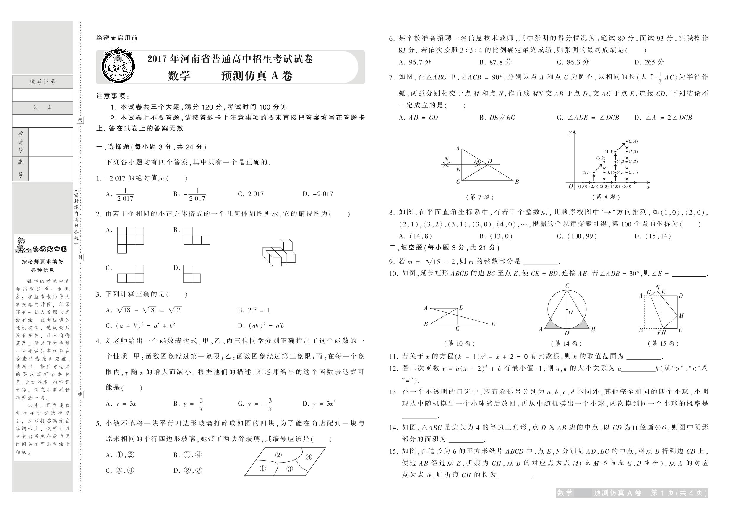 2017年河南省普通高中招生考试试卷数学·预测仿真A卷