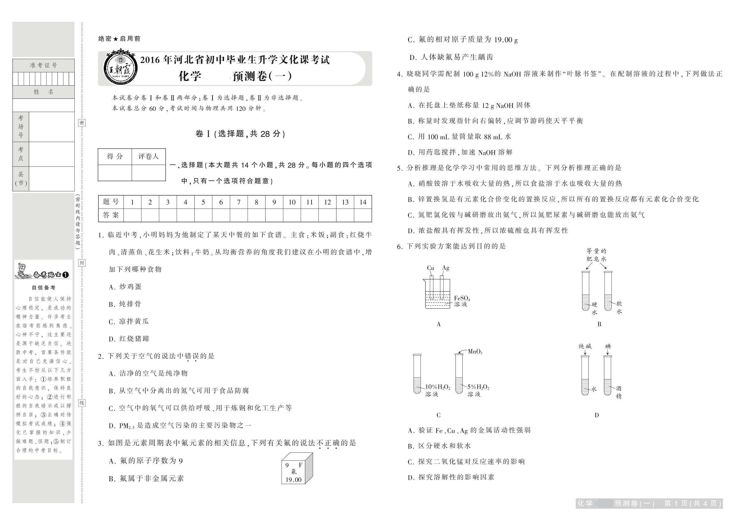 2016年河北省普通高中招生考试试卷化学·预测卷(一)
