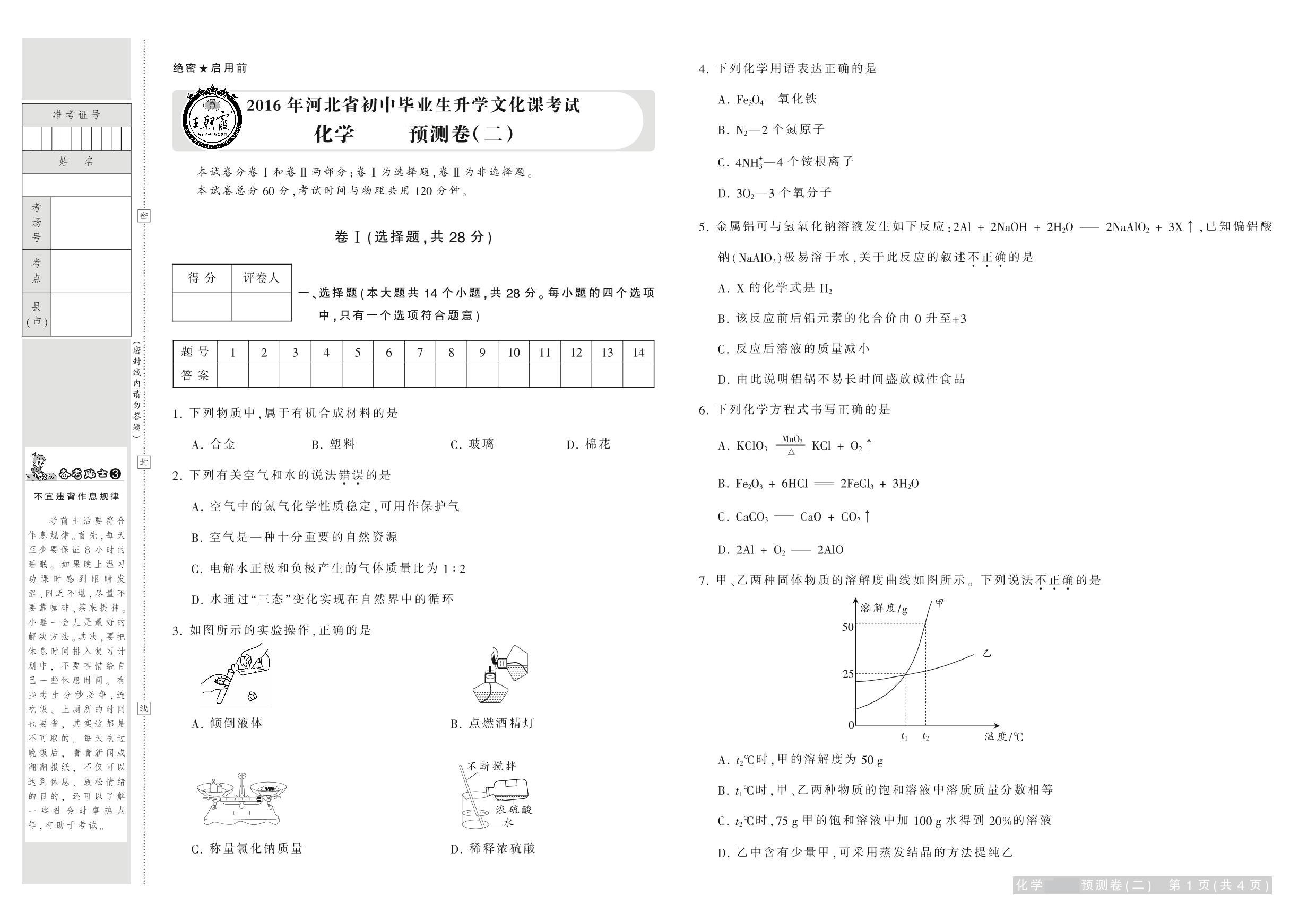 2016年河北省普通高中招生考试试卷化学·预测卷(二)